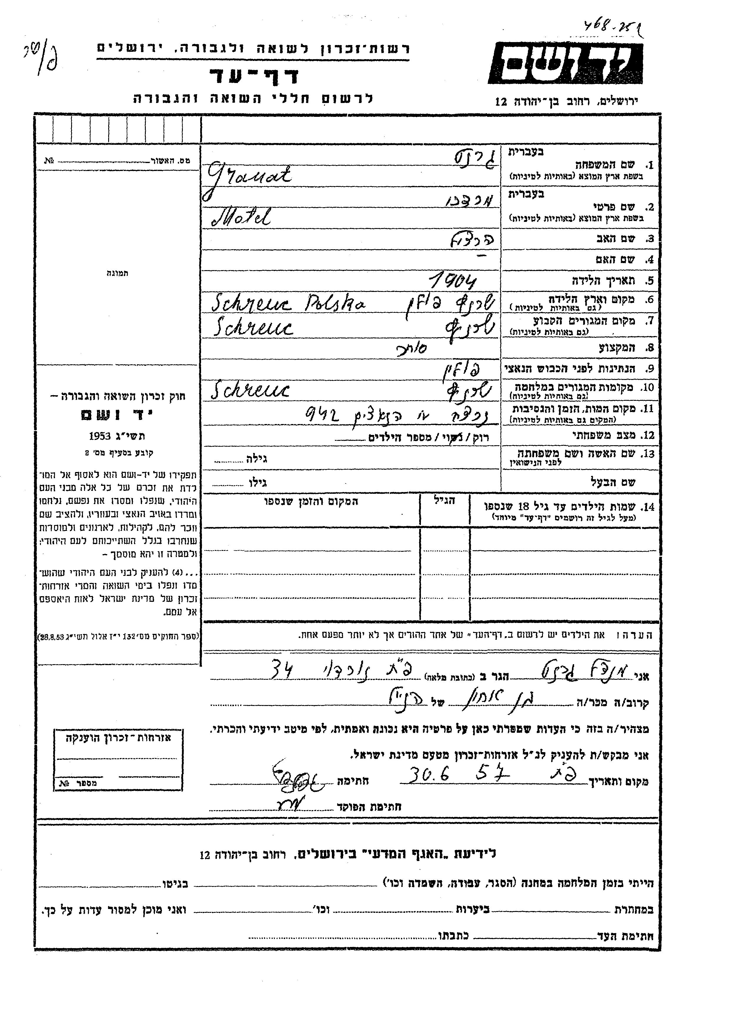 Motel Granat was born in Szrensk, Poland, 1904 to Hertzil. He was a merchant and single. Prior to WWII he lived in Szrensk, Poland. During the war he was in Szrensk, Poland. Motel was murdered in the Shoah. Place of death: unknown, 1942.
