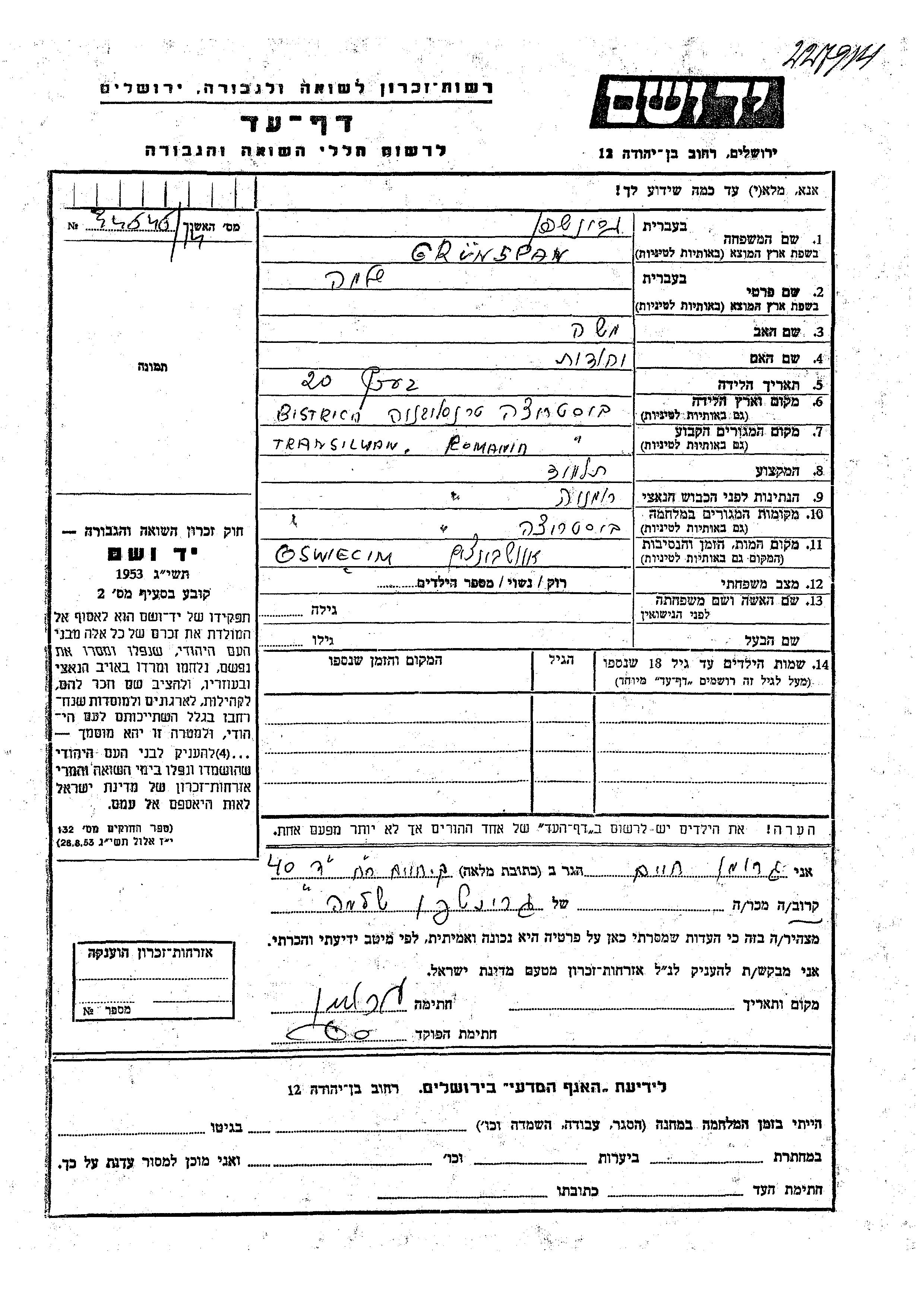 Shlomo Gruenspan was born in Bistrica to Moshe and Yehudit. He was a pupil. Prior to WWII he lived in Transylvania, Romania. During the war he was in Bistrica.