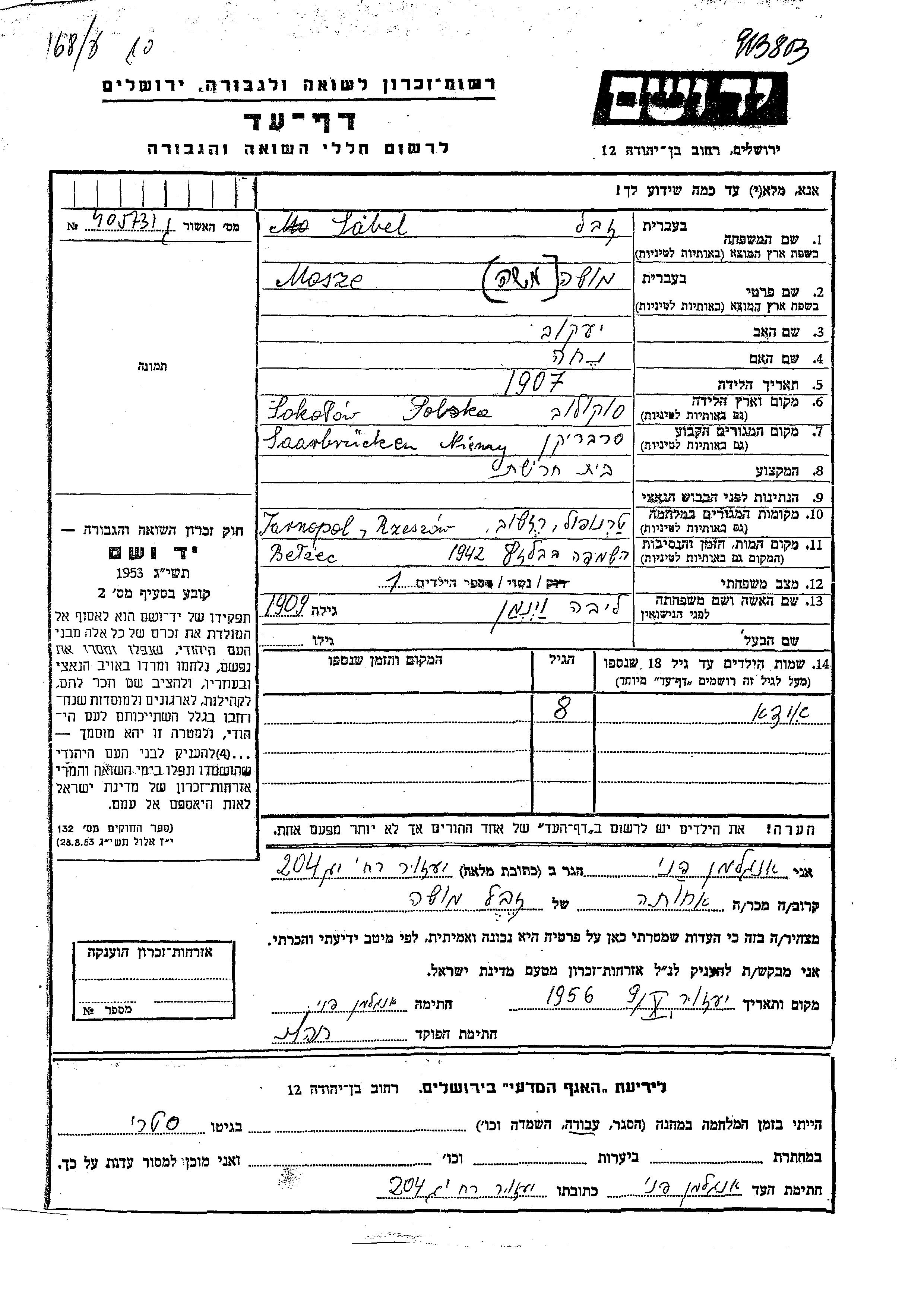 Mosze Sabel was born in Sokolow Malopolski, Poland, 1907 to Yaakov and Nekha. He was married to Liba nee Vinman. Prior to WWII he lived in Saarbruecken, Germany. During the war he was in Rzeszow, Poland. Mosze was murdered in the Shoah. Place of death: Belzec, Poland, 1942.