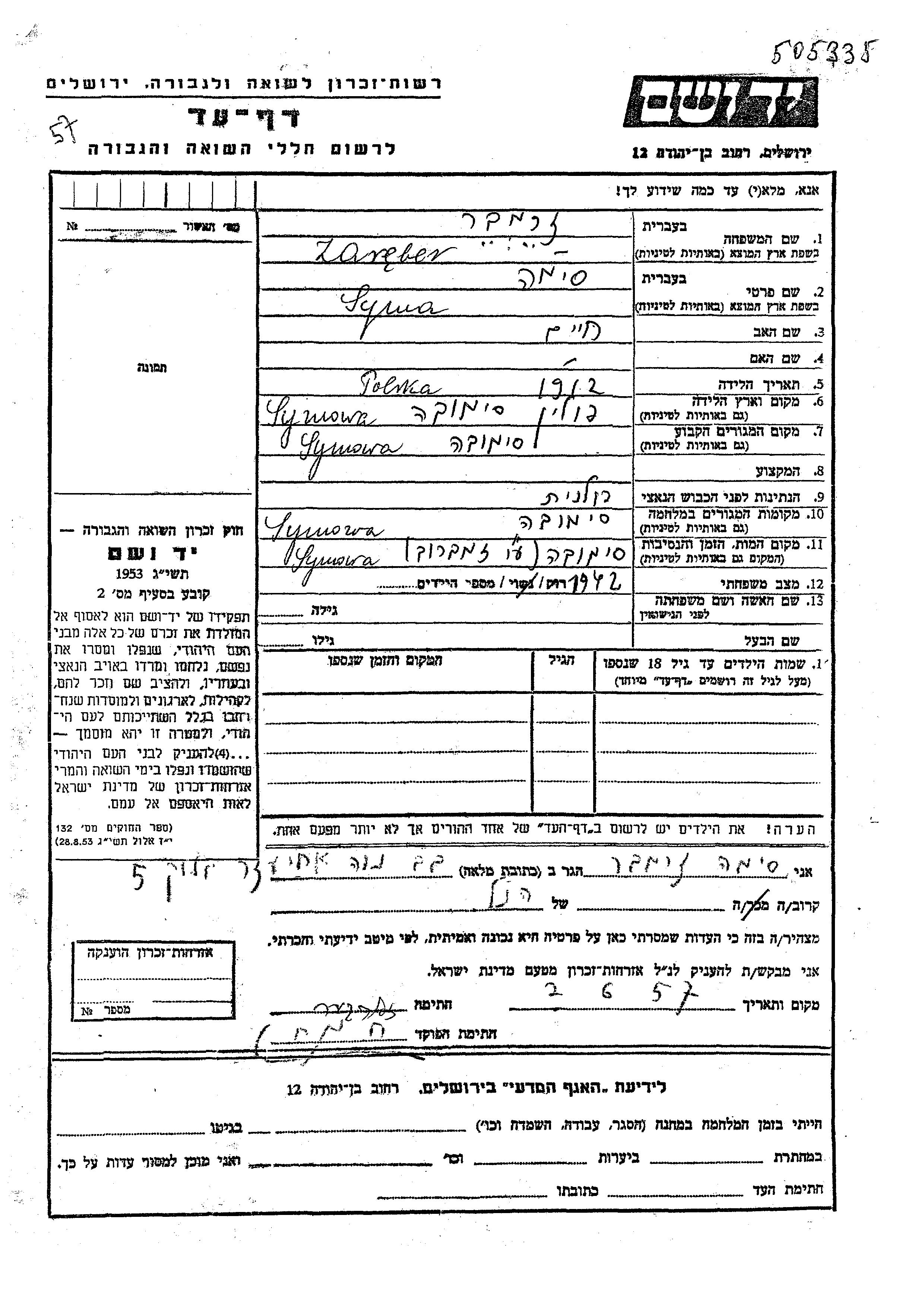 Syma Zareber was born in Simowa, Poland, 1912 to Khaim. She was single. Prior to WWII she lived in Simowa, Poland. During the war she was in Simowa, Poland.