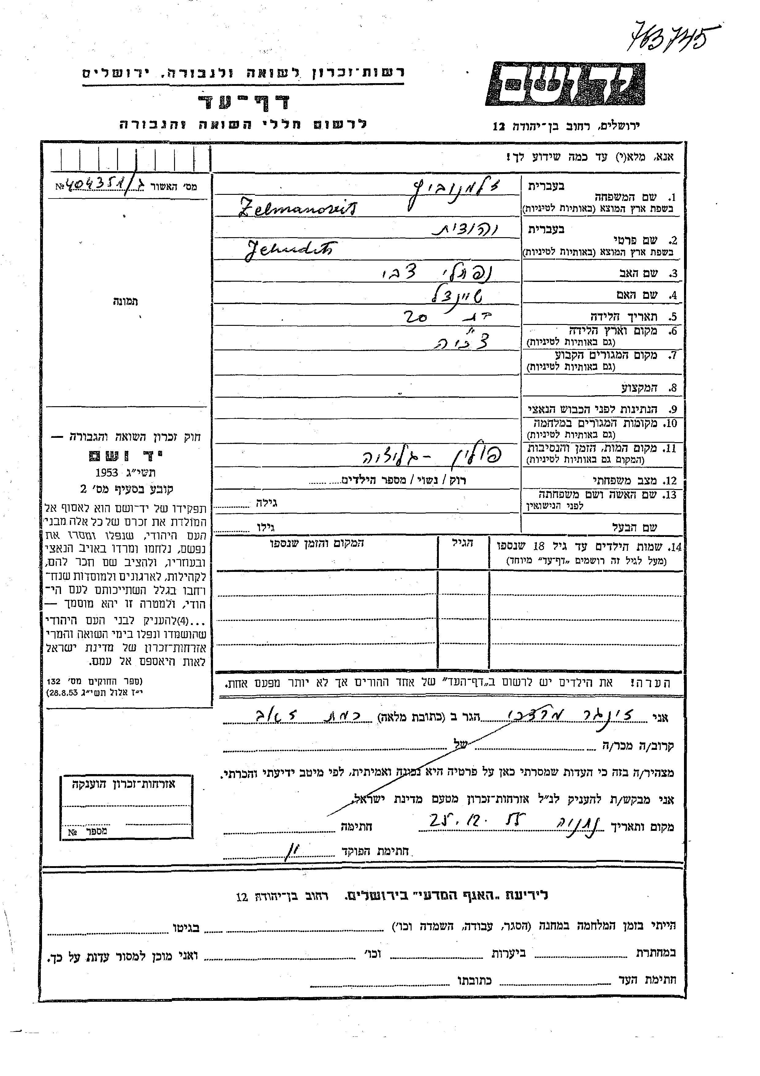 Zelmanovits Yehudit unstated place, Page of Testimony