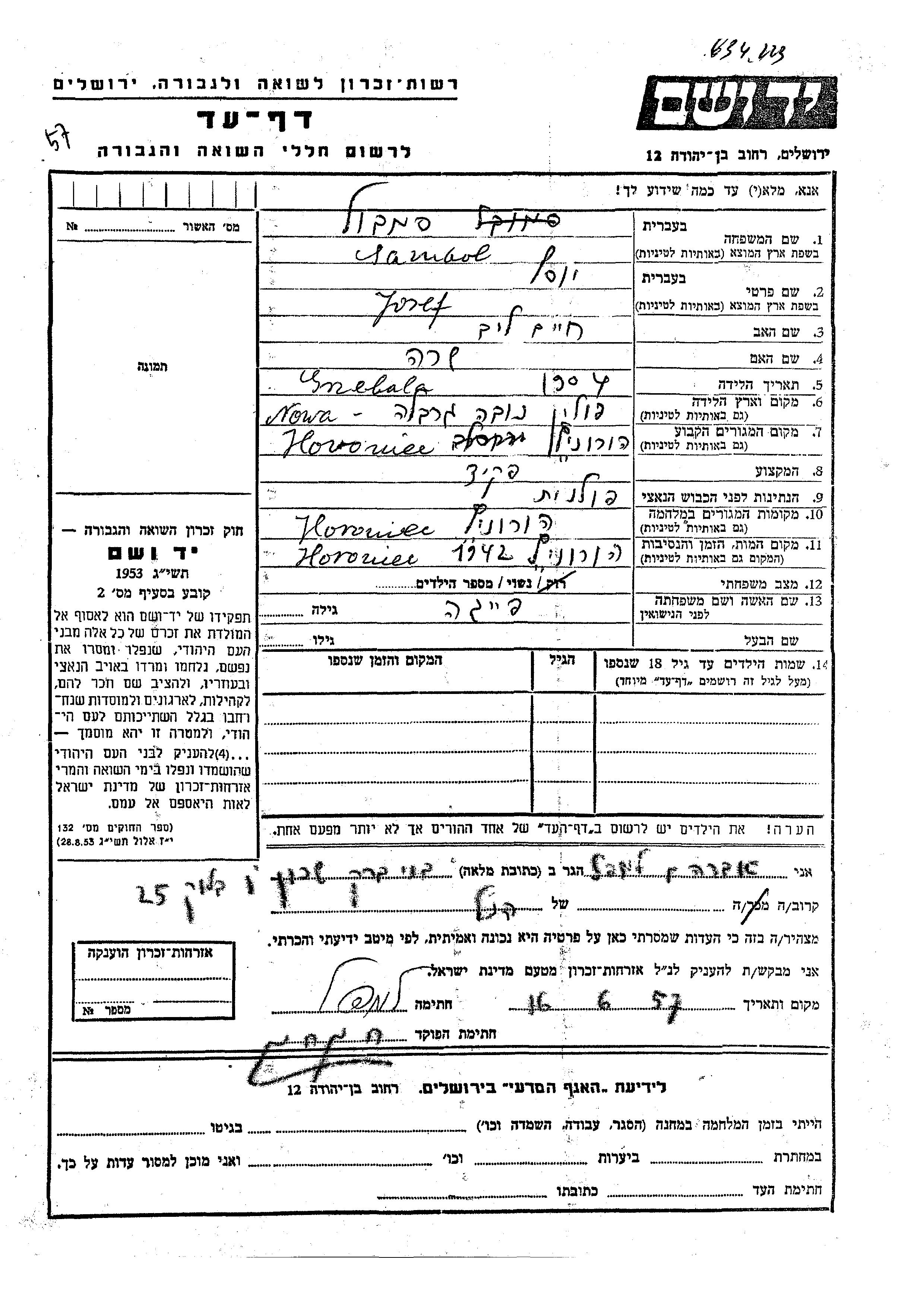 Josef Sanbol Sambol was born in Nowa Grobla, Poland, 1904 to Khaim Leib and Sara. He was a clerk and married to Feiga. Prior to WWII he lived in Horyniec, Poland. During the war he was in Horyniec, Poland. Josef was murdered in the Shoah. Place of death: Horyniec, Poland, 1942.
