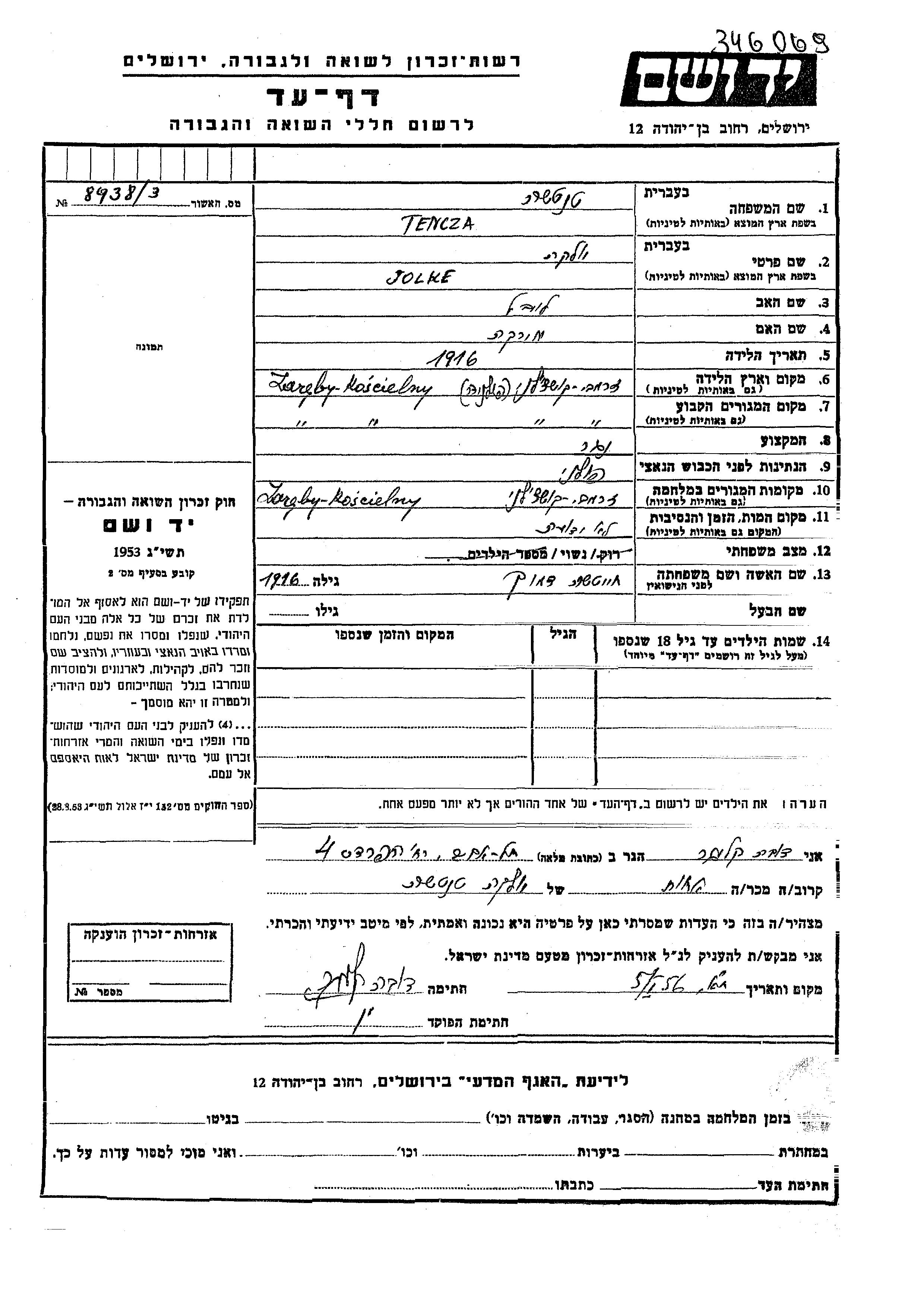 Jolke Iulka Tencza was born in Zareby Koscielne, Poland, 1916 to Leibel and Mirka. He was a carpenter and married to Khaicha nee Dmokh. Prior to WWII he lived in Zareby Koscielne, Poland. During the war he was in Zareby Koscielne, Poland. Jolke Iulka was murdered in the Shoah.