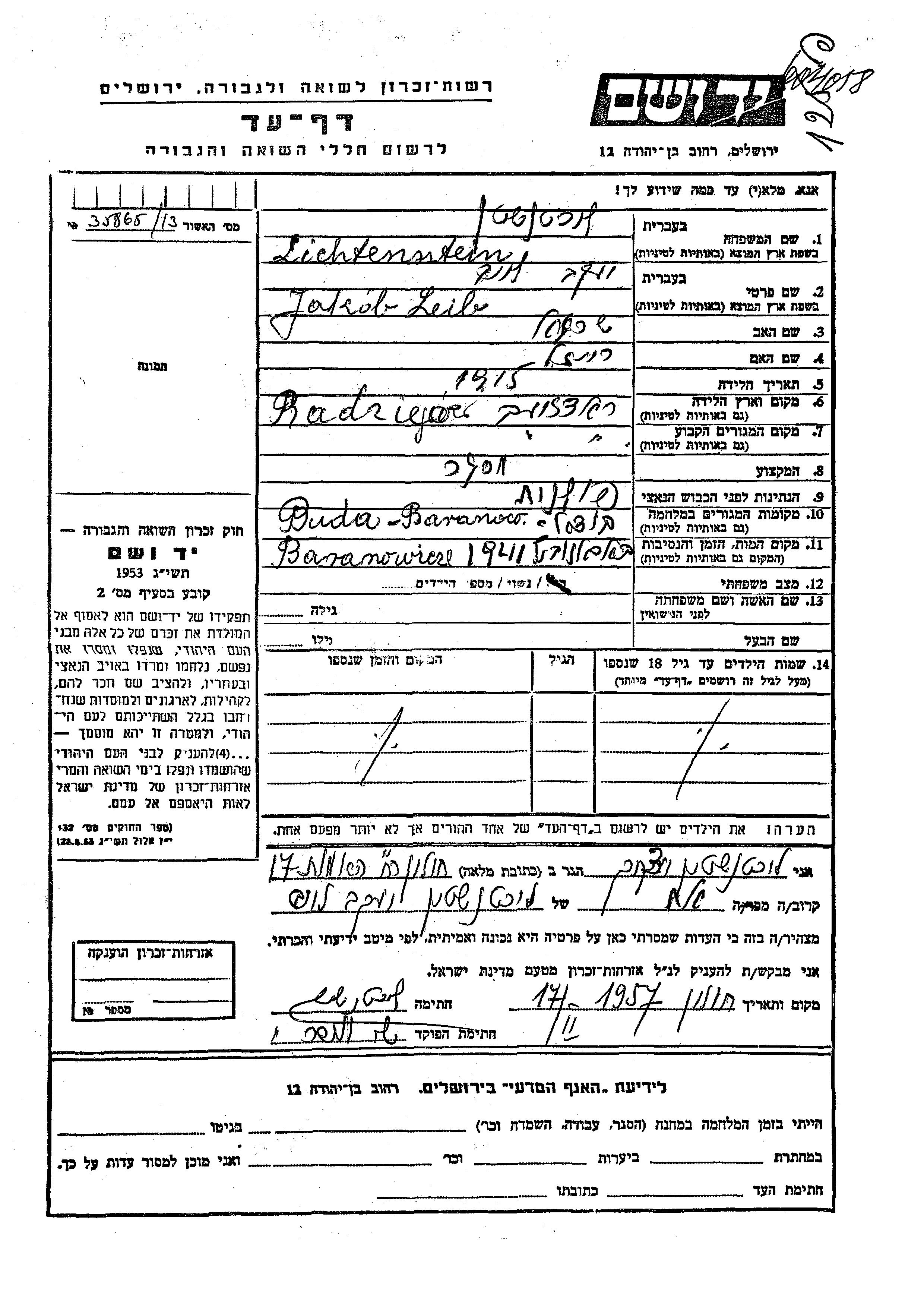 Jakob Leib Lichtensztein was born in Radziejow, Poland, 1915 to Shraga and Reizl. He was a metalworker and married. Prior to WWII he lived in Radziejow, Poland. During the war he was in Budy, Poland. Jakob Leib was murdered in the Shoah. Place of death: Baranowicz, Poland, 1941.