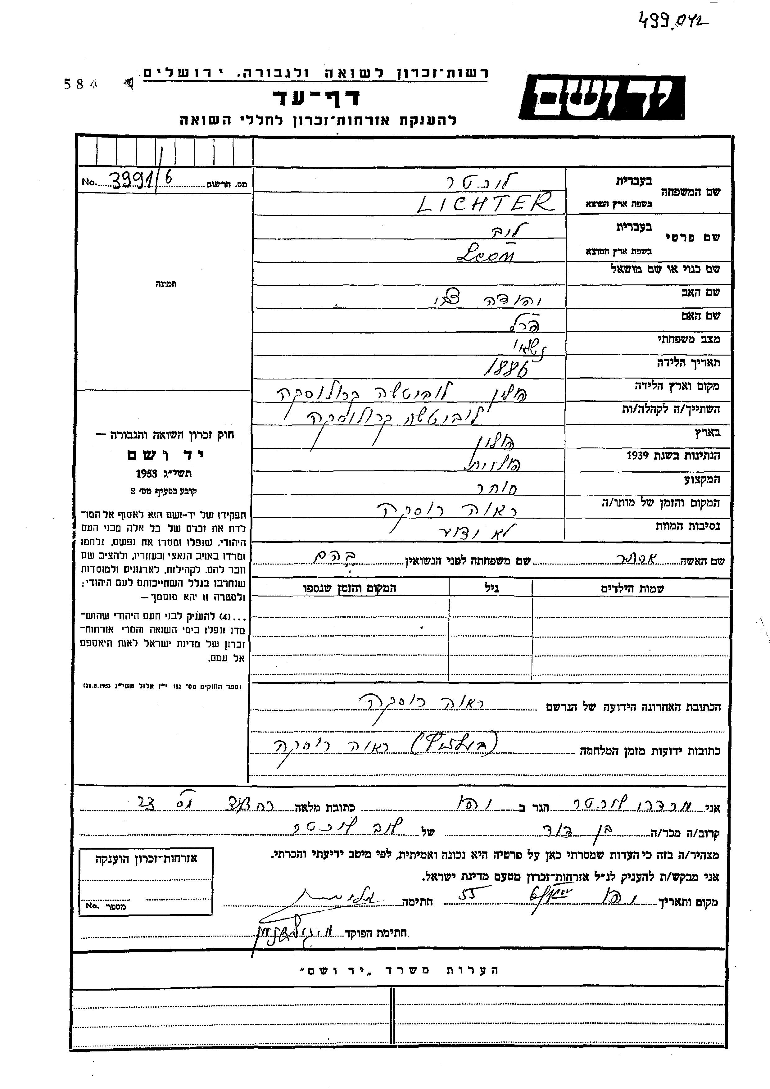 Lichter Leib Leon 1886 Lubycza Krolewska, Poland Page of Testimony
