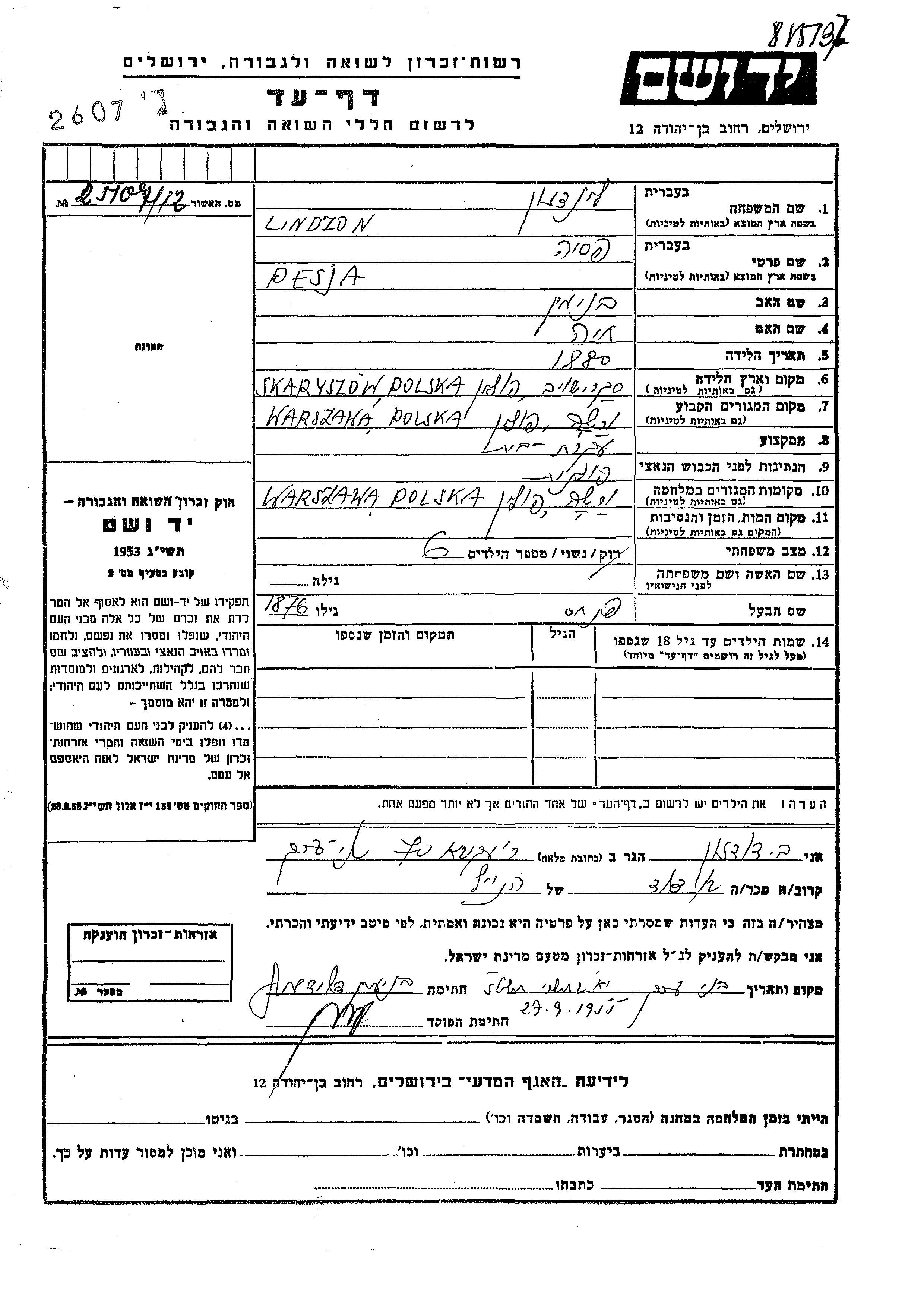 Pesja Lindzon was born in Skaryszew, Poland, 1880 to Beniamin and Khaia. She was a housewife and married to Pinkhas. Prior to WWII she lived in Warsaw, Poland. During the war she was in Warsaw, Poland. Pesja was murdered in the Shoah.