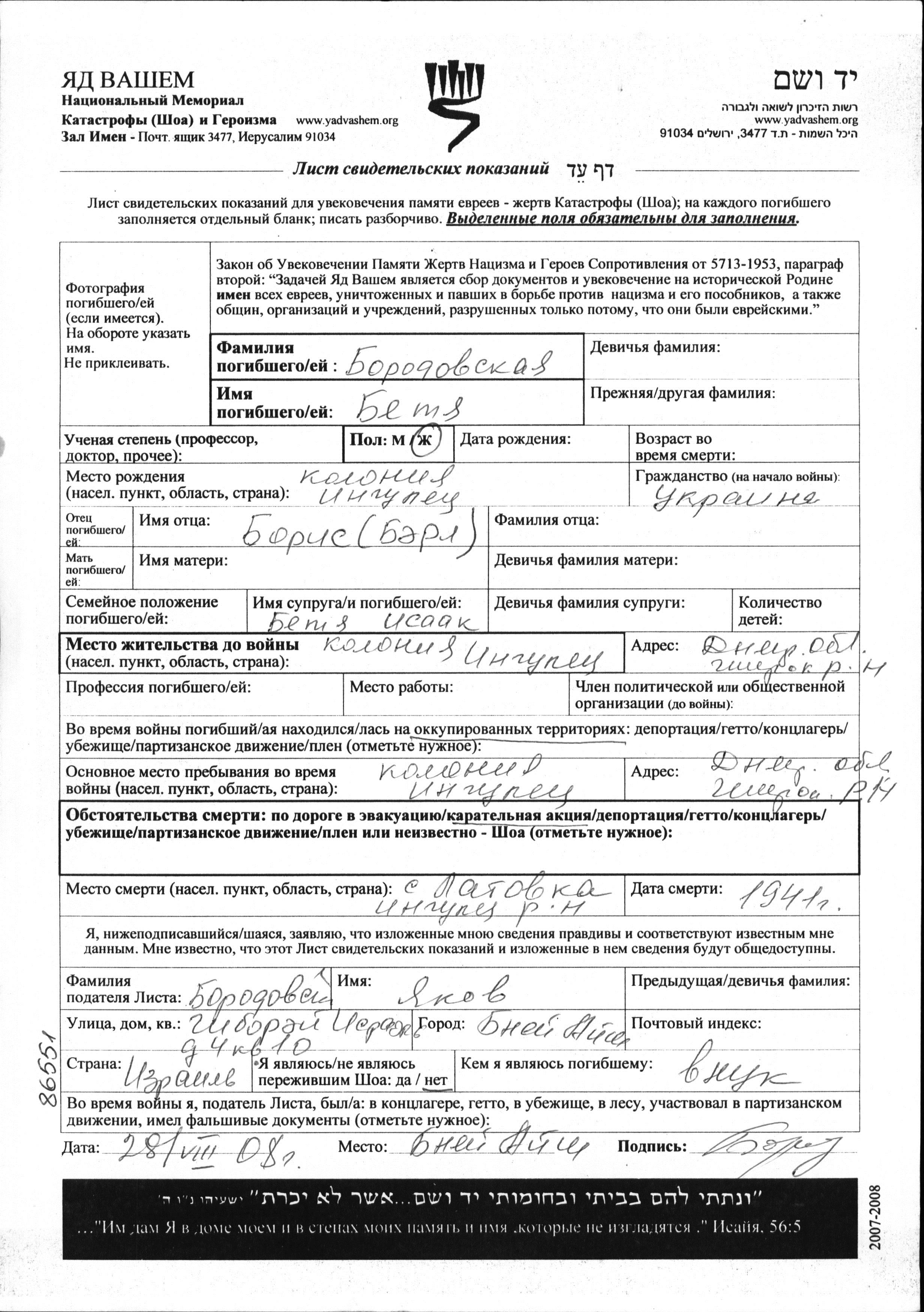 Betya Borodovskaya was born in Ingulets, Ukraine (USSR) to Boris Berl. She was married to Isaak. Prior to WWII she lived in Ingulets, Ukraine (USSR). During the war she was in Ingulets, Ukraine (USSR). Betya was murdered in the Shoah. Place of death: Latovka, Ukraine (USSR), 1941.