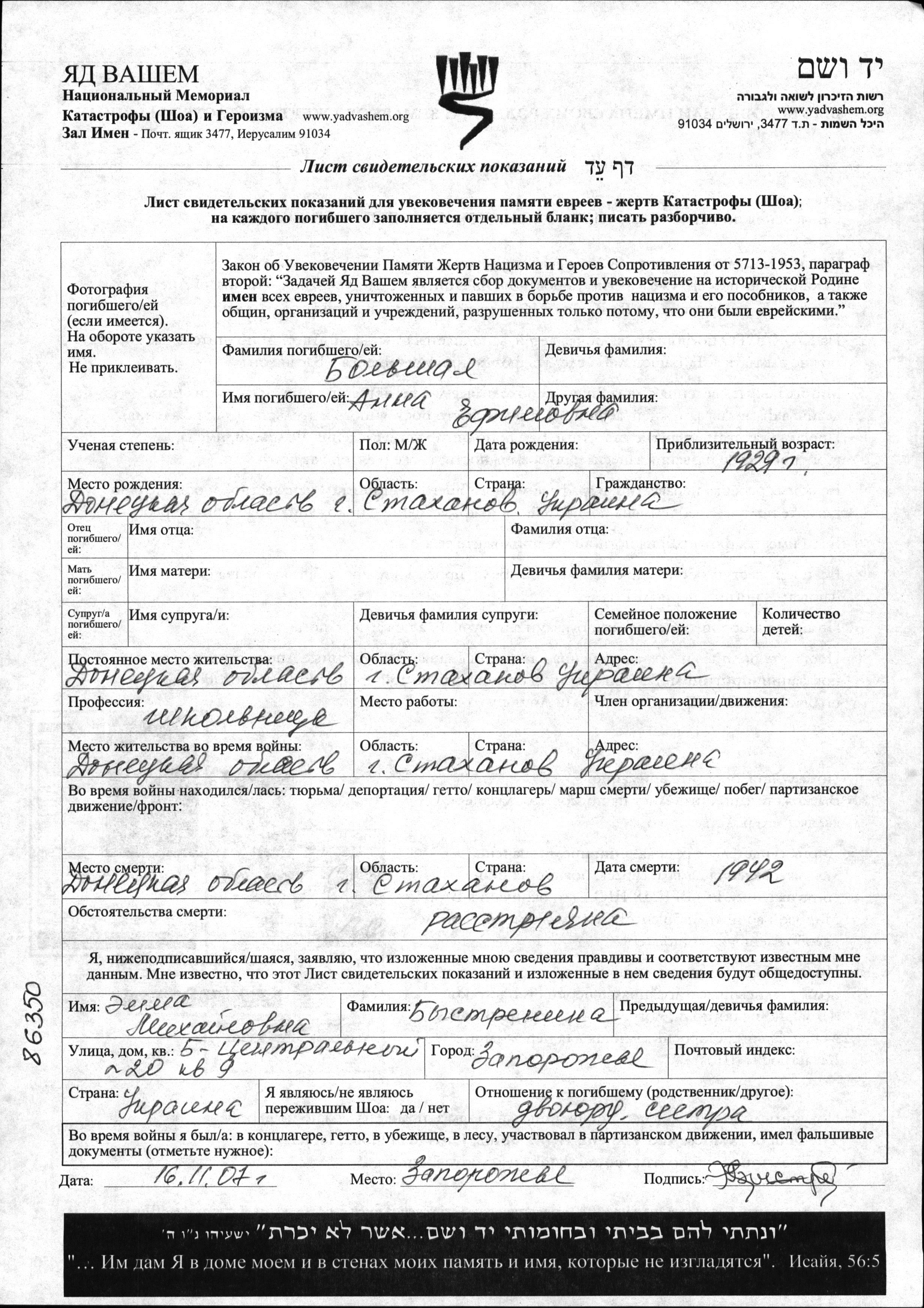 Anna Bolshaya was born in Stakhanov, Ukraine (USSR), 1929 to Yefim. She was a schoolgirl and child. Prior to WWII she lived in Stakhanov, Ukraine (USSR). During the war she was in Stakhanov, Ukraine (USSR). Anna was murdered in the Shoah. Place of death: Stakhanov, Ukraine (USSR), 1942.