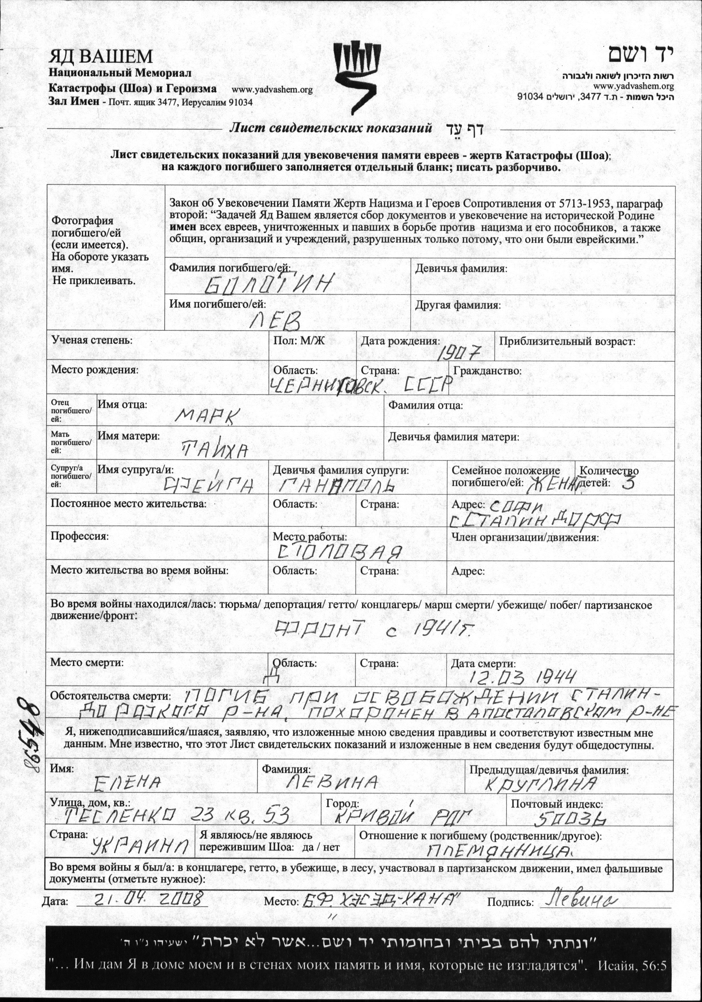 Lev Bolotin was born in Chernigov, Ukraine (USSR), 1907 to Mark and Taykha. He was a rabotnik stolovoy and married to Feyga nee Ganopol. Prior to WWII he lived in Stalindorf, Ukraine (USSR). During the war he was in the Soviet armed forces. Lev was killed in military service in WWII. Place of death: Apostolove, Ukraine (USSR), 12/03/1944.