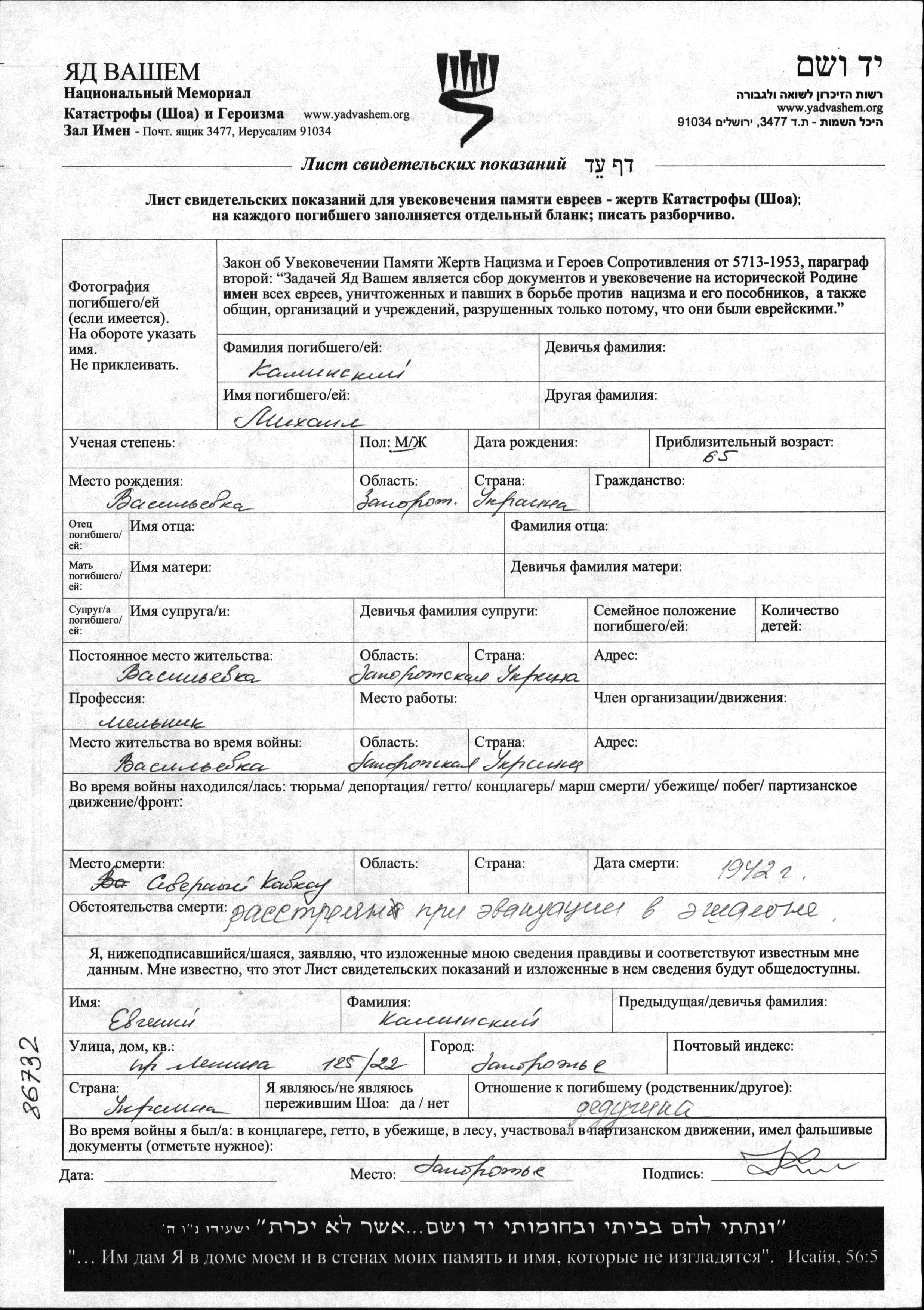 Kaminski Mikhail Vasilyevka, Ukraine (USSR) Page of Testimony