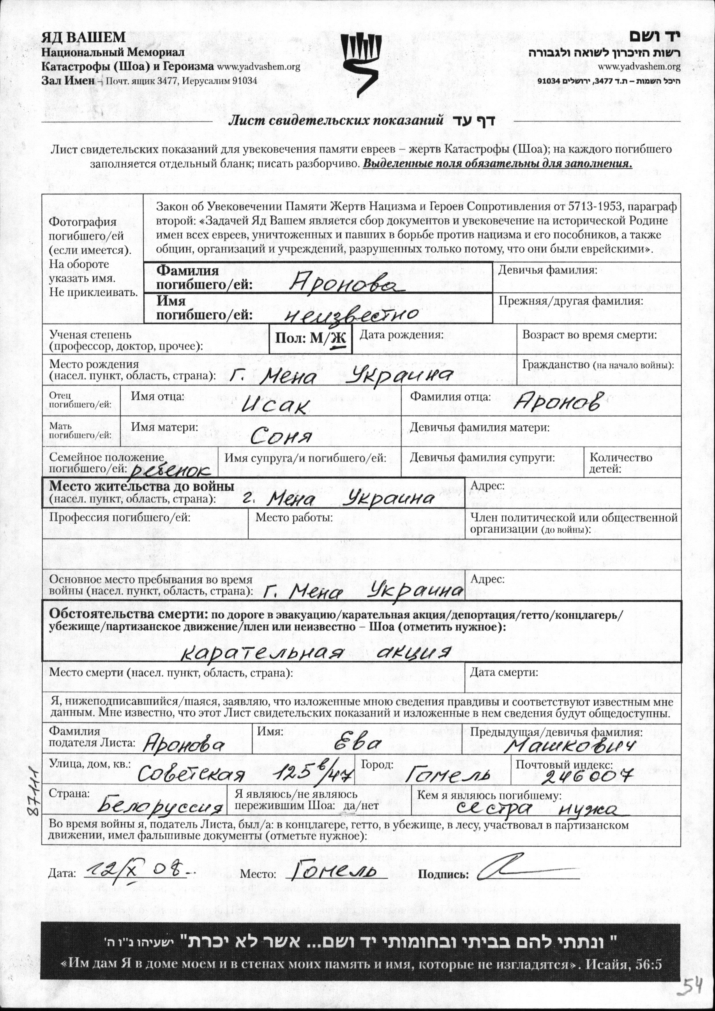 Aronova First name unknown Mena, Ukraine (USSR) Page of Testimony