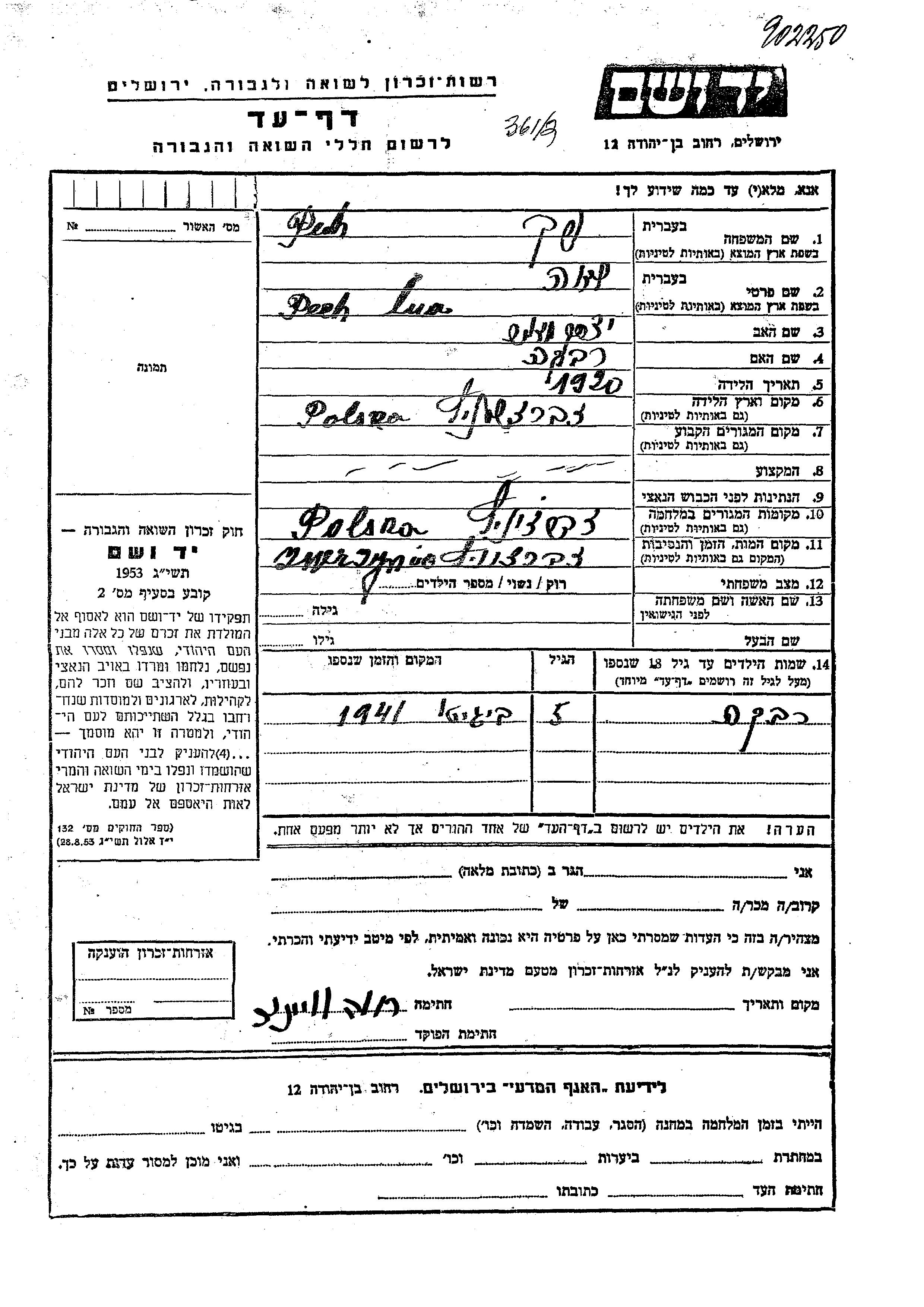 Lea Pech Pekh was born in Zwierzyniec, Poland, 1920 to Yitzkhak Hersh and Rivka. She was married. During the war she was in Zwierzyniec, Poland. Lea was murdered in the Shoah. Place of death: Zwierzyniec, Poland.