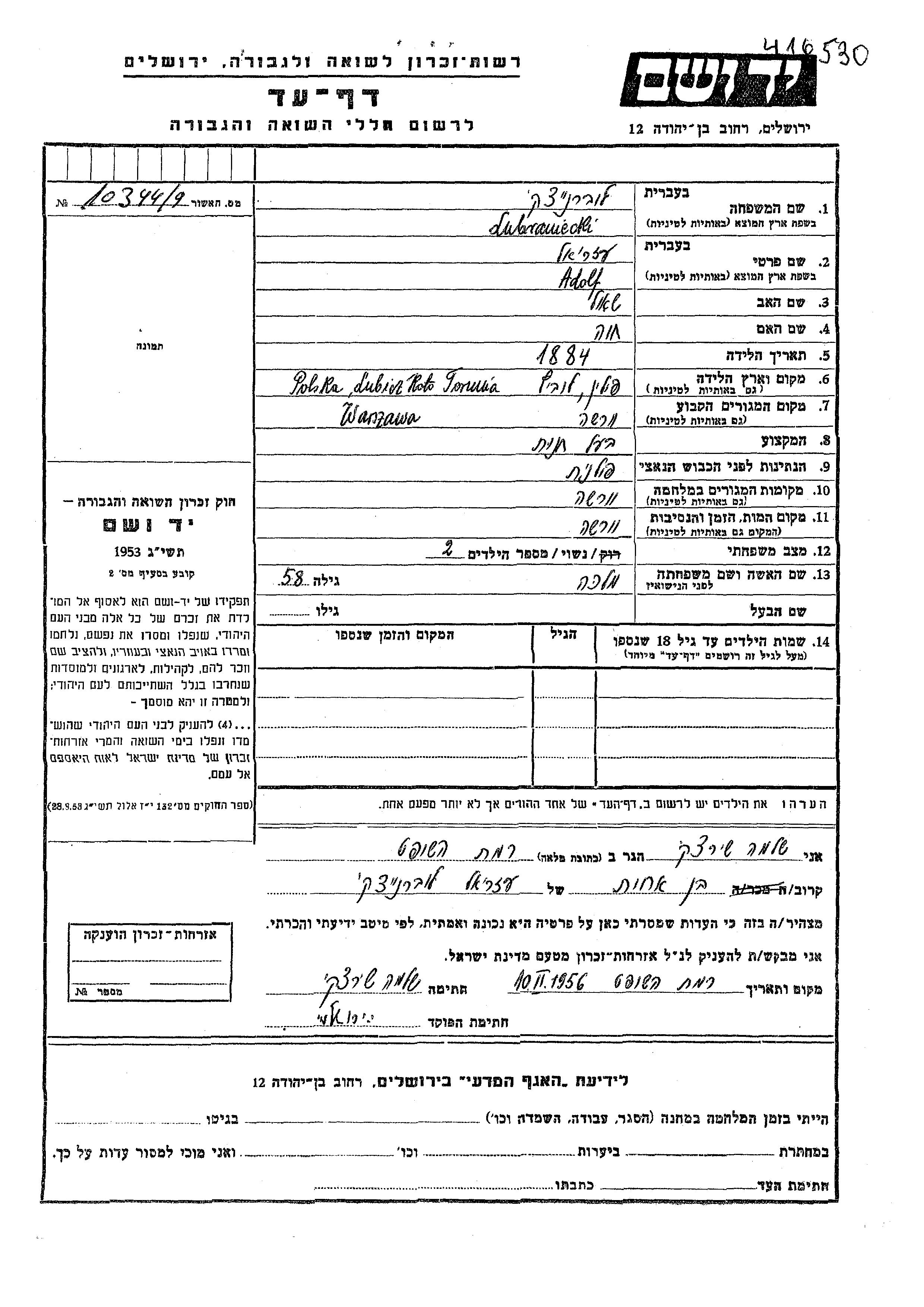 Lubraniecki Adolf Azriel 1884 Warsaw, Poland Page of Testimony