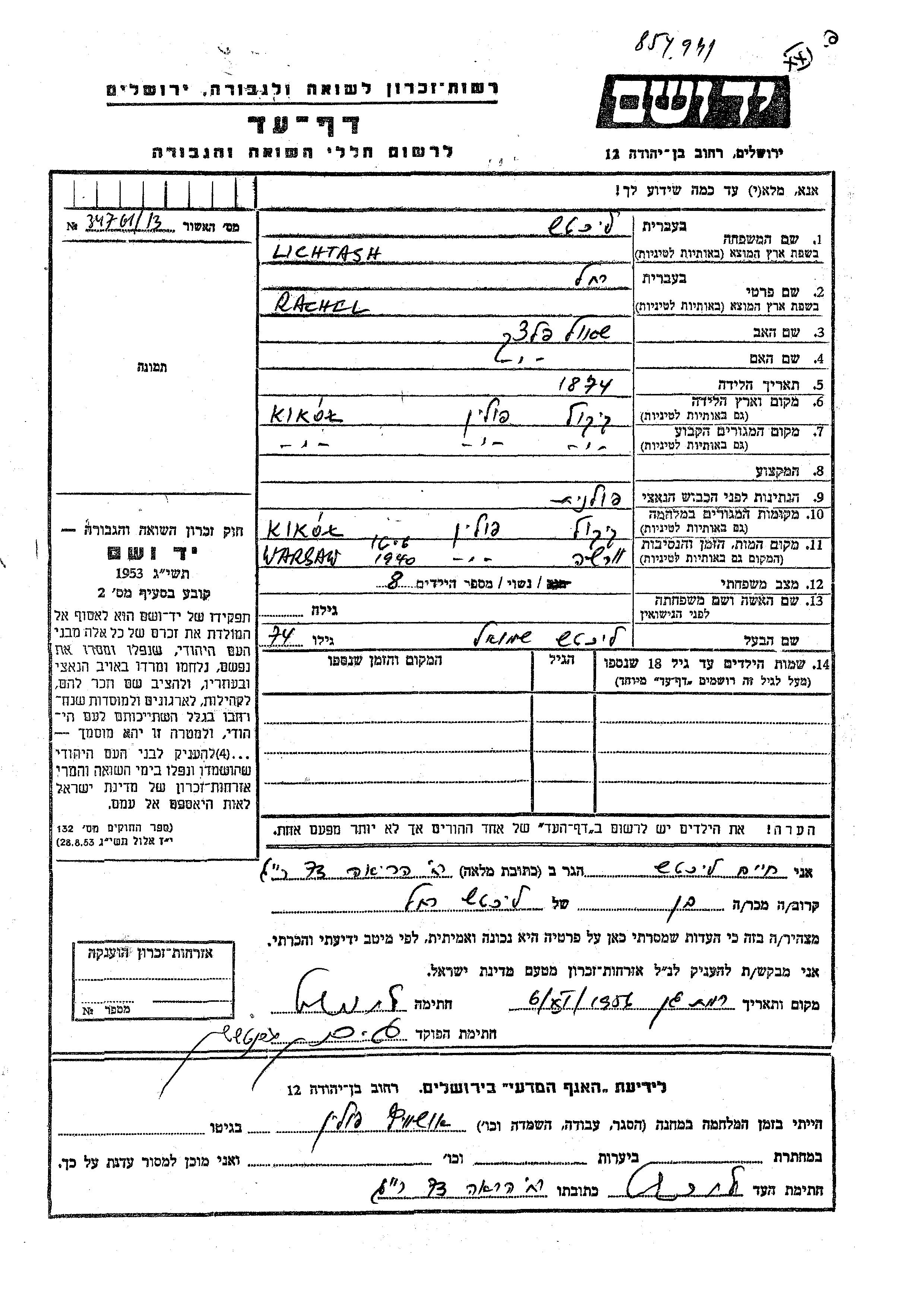 Rachel Lichtash nee Plachek was born in Kikol, Poland, 1874 to Shaul. She was married to Shmuel. Prior to WWII she lived in Kikol, Poland. During the war she was in Kikol, Poland. Rachel was murdered in the Shoah. Place of death: Warszawa, Poland, 1940.