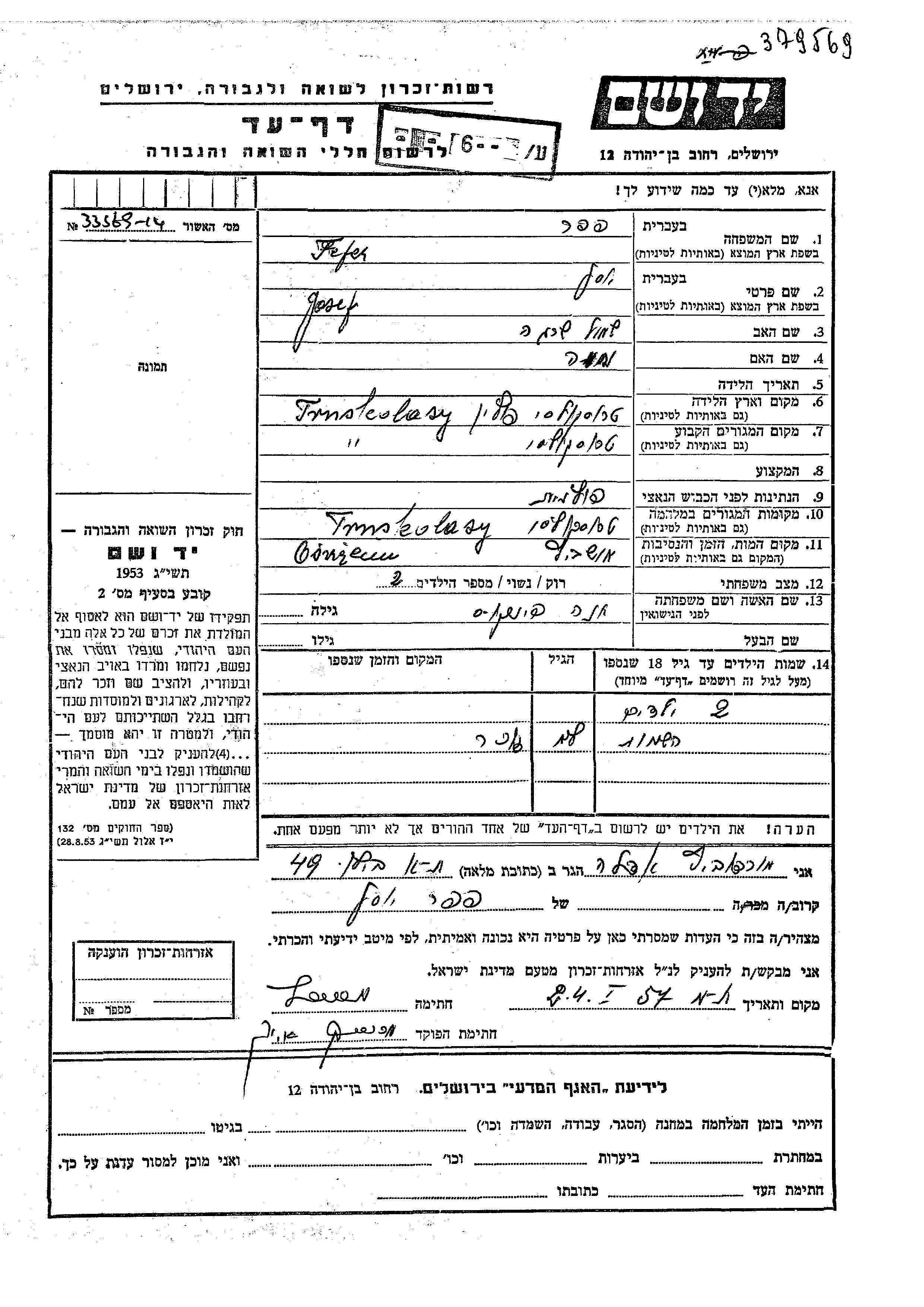 Josef Fefer was born in Truskolasy, Poland to Shmul Shraga and Mia. He was married to Ana nee Fishkis. Prior to WWII he lived in Truskolasy, Poland. During the war he was in Truskolasy, Poland. Josef was murdered in the Shoah. Place of death: Auschwitz, Poland.