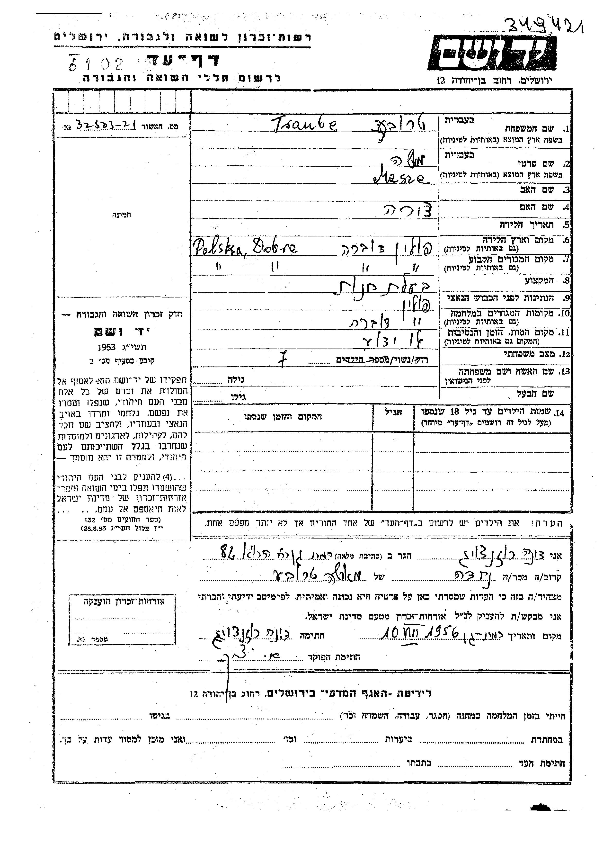 Masze Masha Traube was born in Dobre, Poland to Tzira. She was a shop owner and married. Prior to WWII she lived in Dobre, Poland. During the war she was in Dobre, Poland.