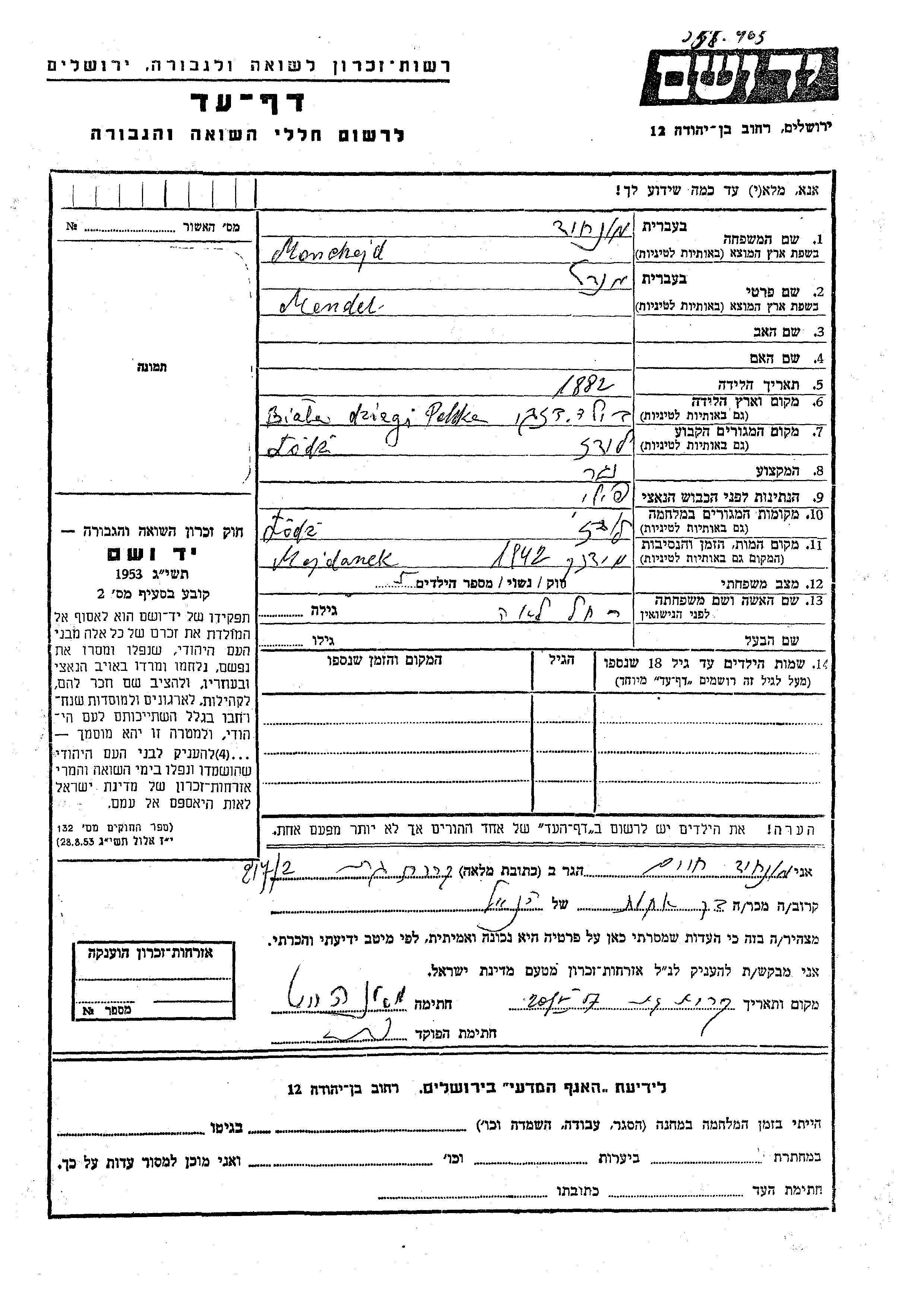 Mendel Monchejd was born in Bialobrzegi, Poland, 1882. He was a carpenter and married to Rakhel Lea. Prior to WWII he lived in Lodz, Poland. During the war he was in Lodz, Poland. Mendel was murdered in the Shoah. Place of death: Majdanek, Poland, 1942.