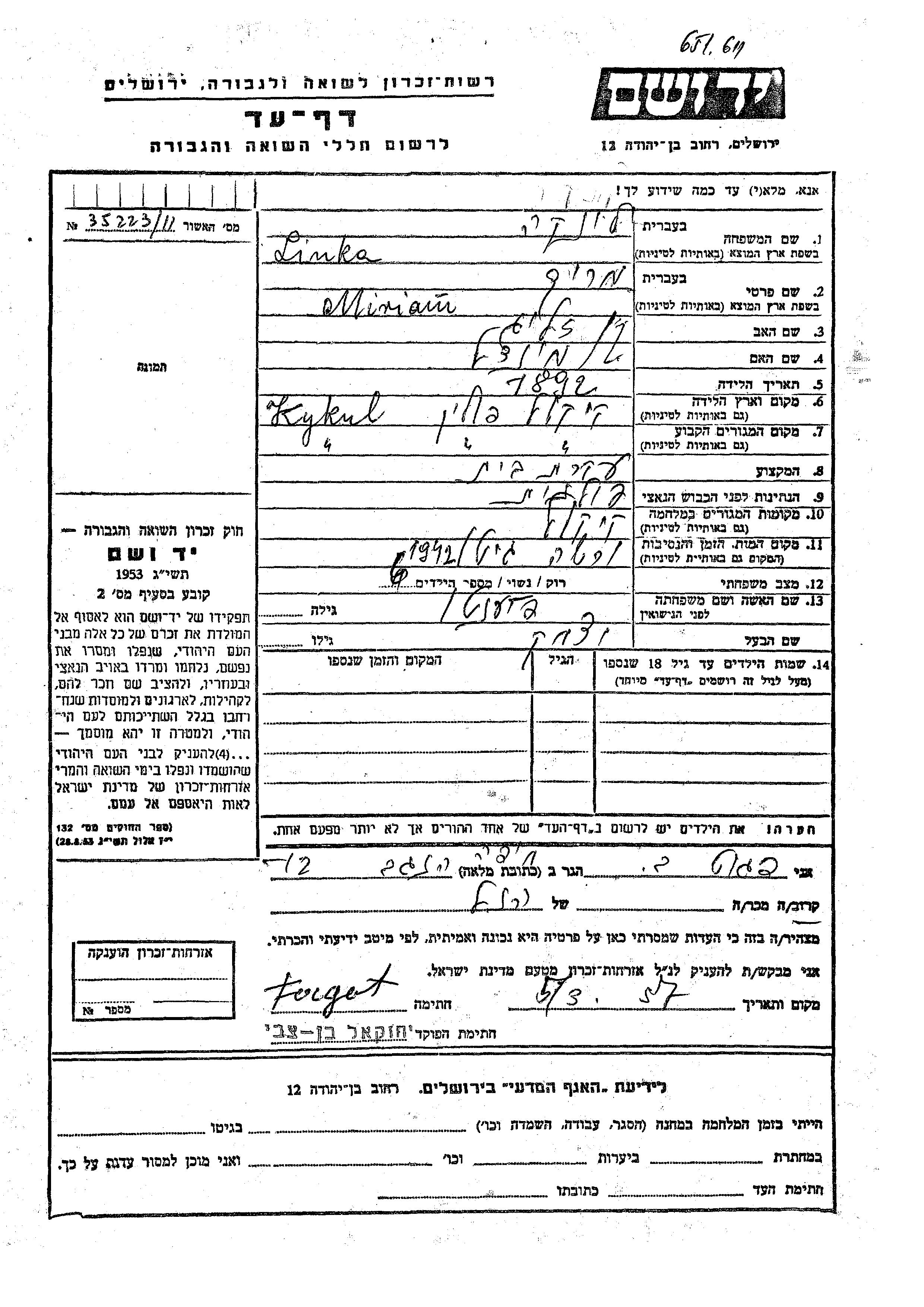 Miryam Linka nee Pinikash was born in Kikol, Poland, 1892 to Zelig and Mindl. She was a housewife and married to Yitzkhak. Prior to WWII she lived in Kikol, Poland. During the war she was in Kikol, Poland. Miryam was murdered in the Shoah. Place of death: Warsaw, Poland, 1942.