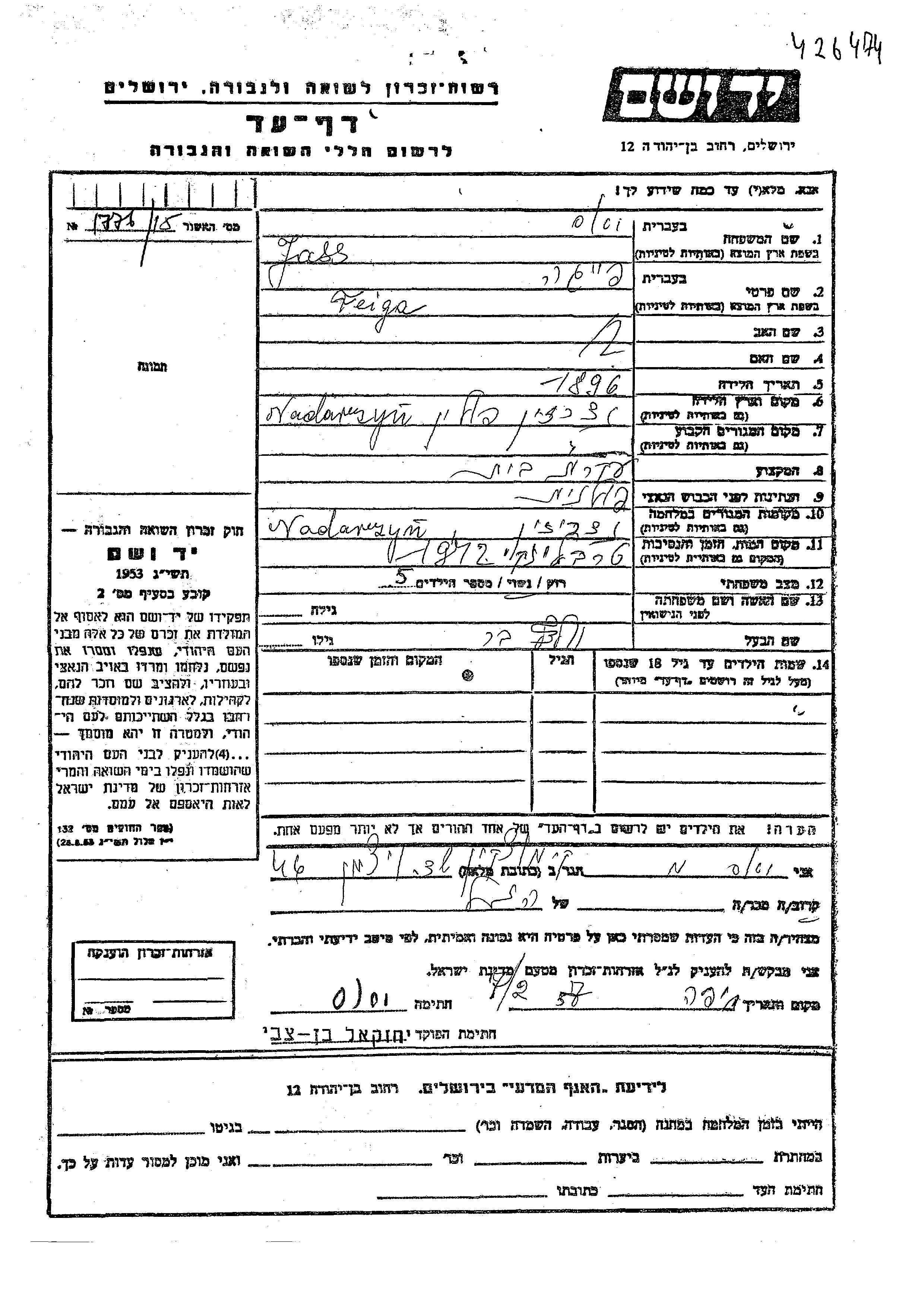 Feiga Jass was born in Nadarzyn, Poland, 1896. She was a housewife and married to Ber. Prior to WWII she lived in Nadarzyn, Poland. During the war she was in Nadarzyn, Poland. Feiga was murdered in the Shoah. Place of death: Treblinka, Poland, 1942.