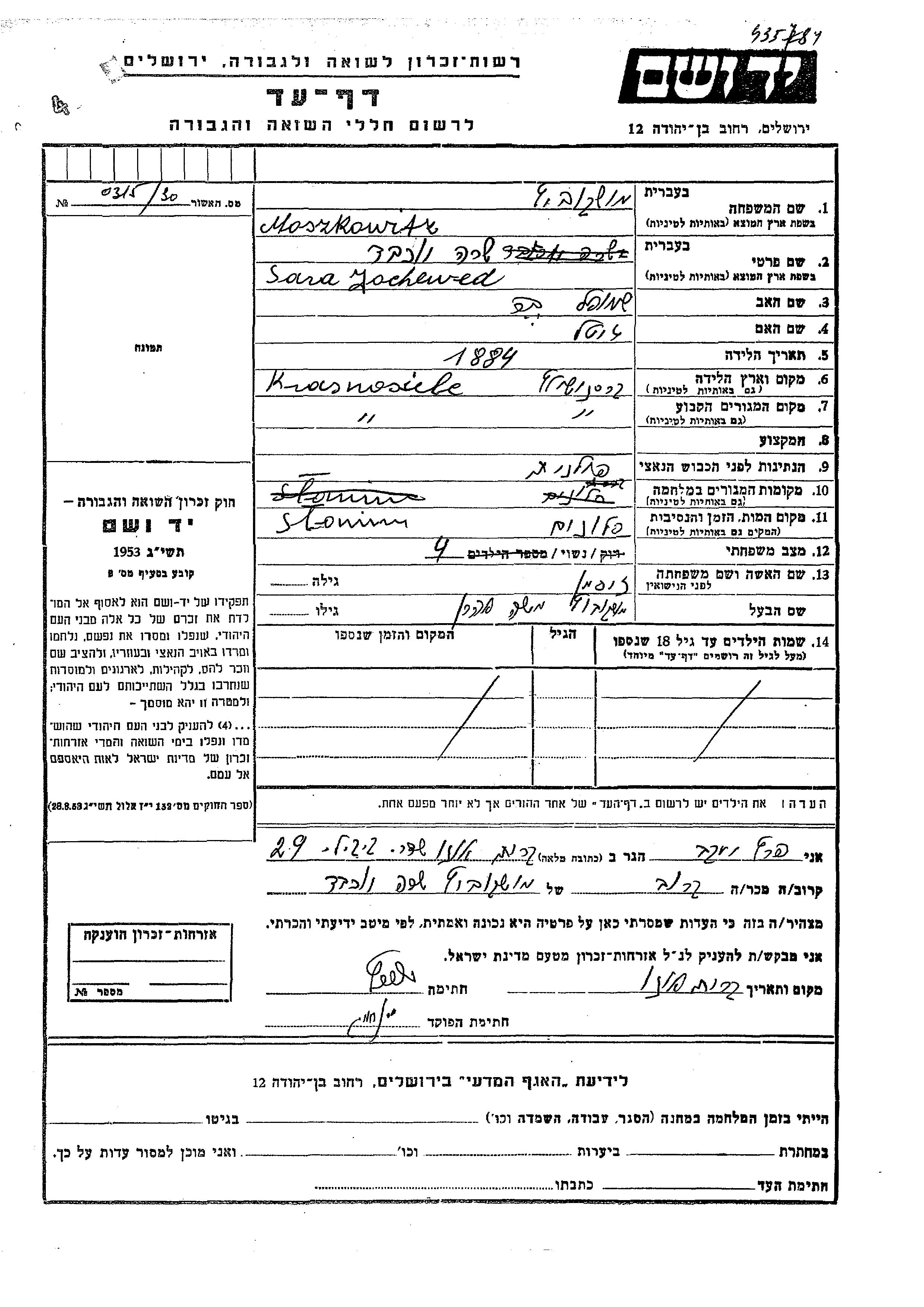 Jochewed Sara Moszkowicz nee Zisman was born in Krasnosielc, Poland, 1884 to Shmuel and Gitel. She was married to Moshe Aharon. Prior to WWII she lived in Krasnosielc, Poland. Jochewed Sara was murdered in the Shoah. Place of death: Slonim, Poland.