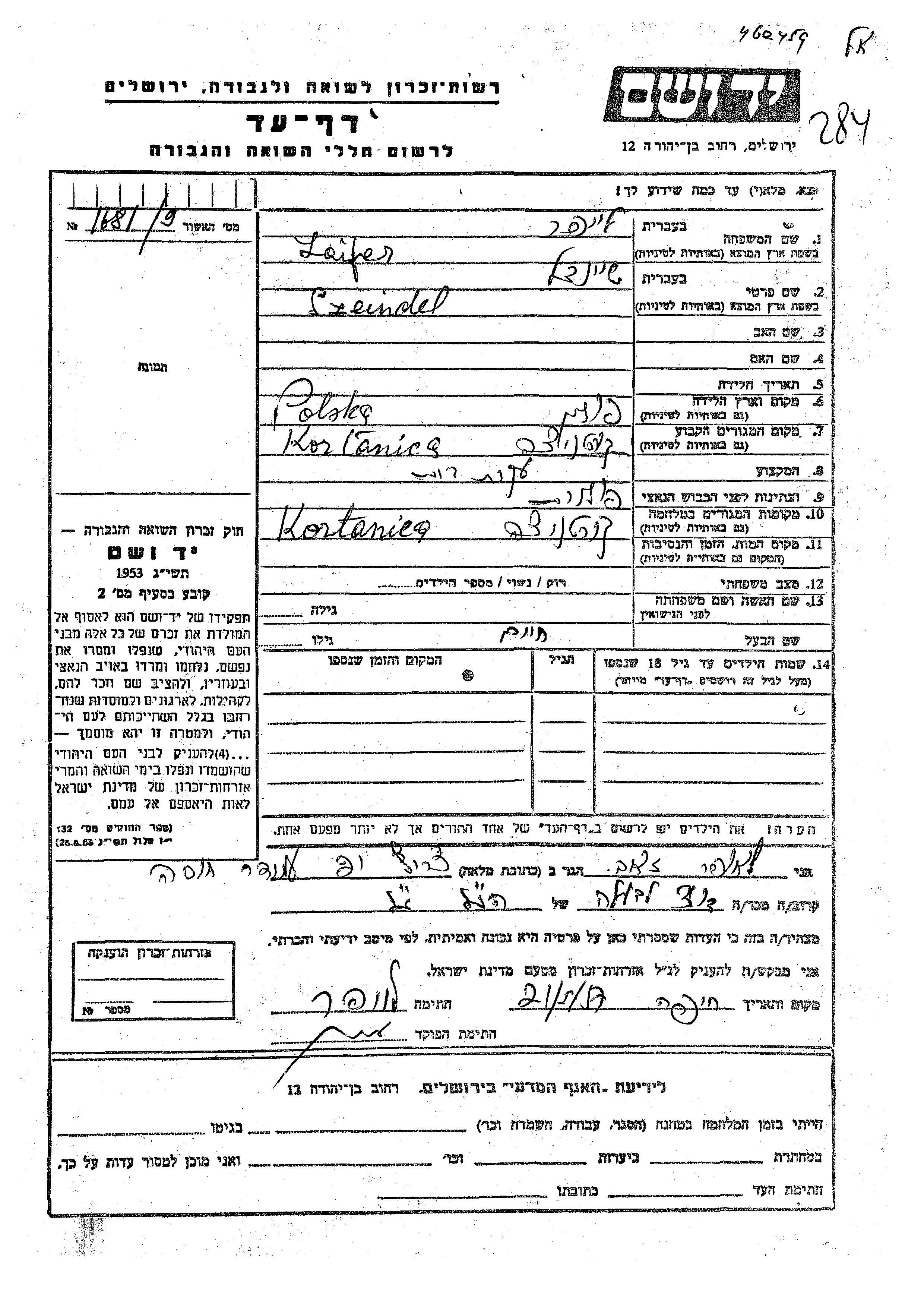 Szeindel Laifer was born in Poland. She was a housewife and married to Khaim. Prior to WWII she lived in Kortanica, Poland. During the war she was in Kortanica, Poland. Szeindel was murdered in the Shoah.
