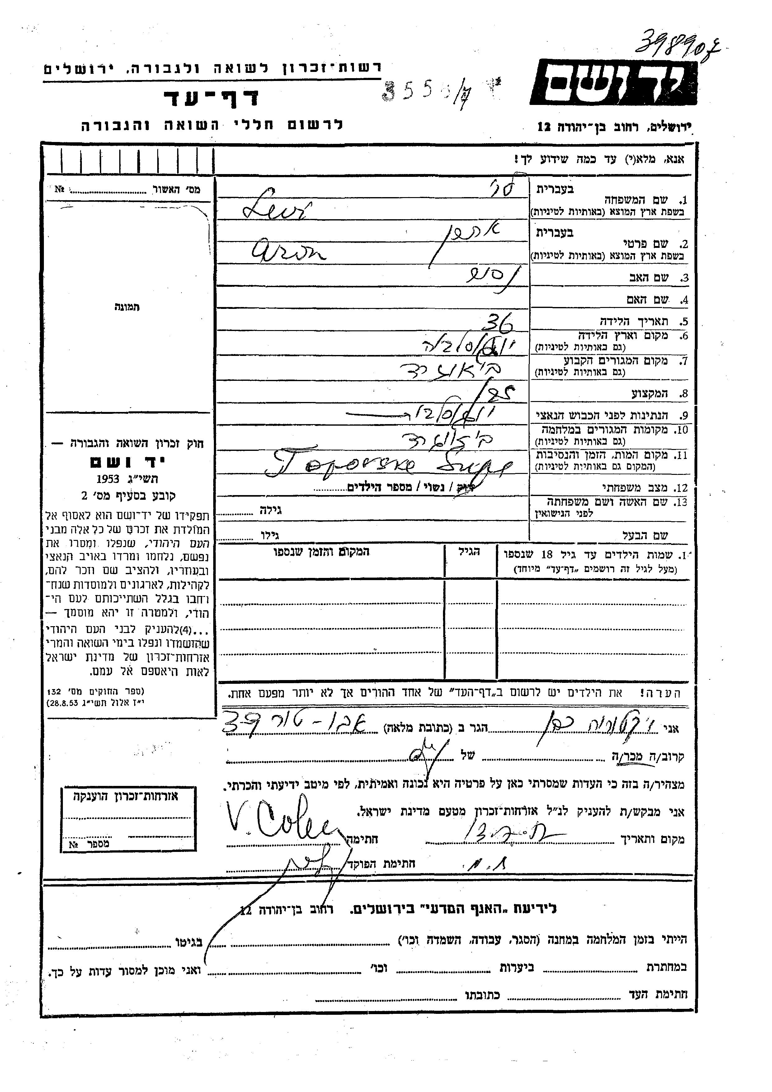 Levi Aron Belgrad, Yugoslavia Page of Testimony