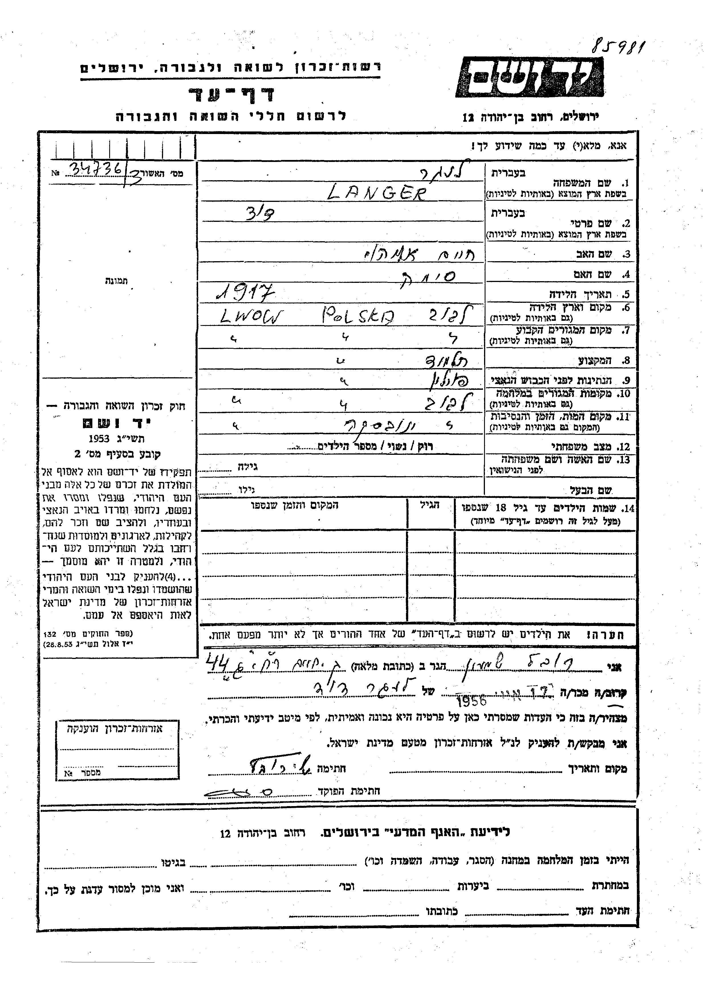 David Langer was born in Lwow, Poland, 1917 to Khaim Eliahu and Sima. He was a pupil. Prior to WWII he lived in Lwow, Poland. During the war he was in Lwow, Poland. David was murdered in the Shoah. Place of death: Lwow, Poland.