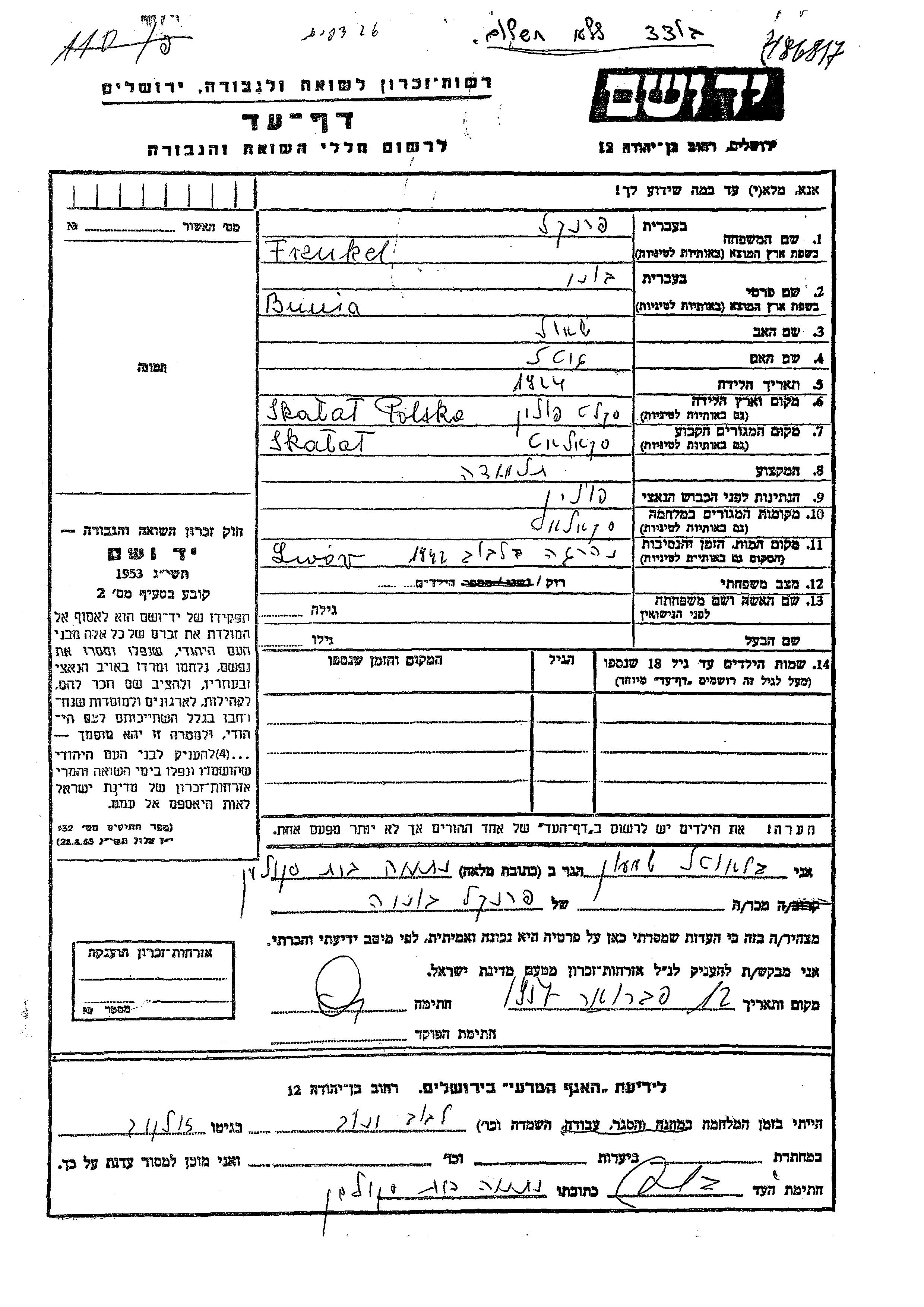 Bunia Frenkel was born in Skalat, Poland, 1924 to Shaul and Gitel. She was a pupil and single. Prior to WWII she lived in Skalat, Poland. During the war she was in Skalat, Poland.