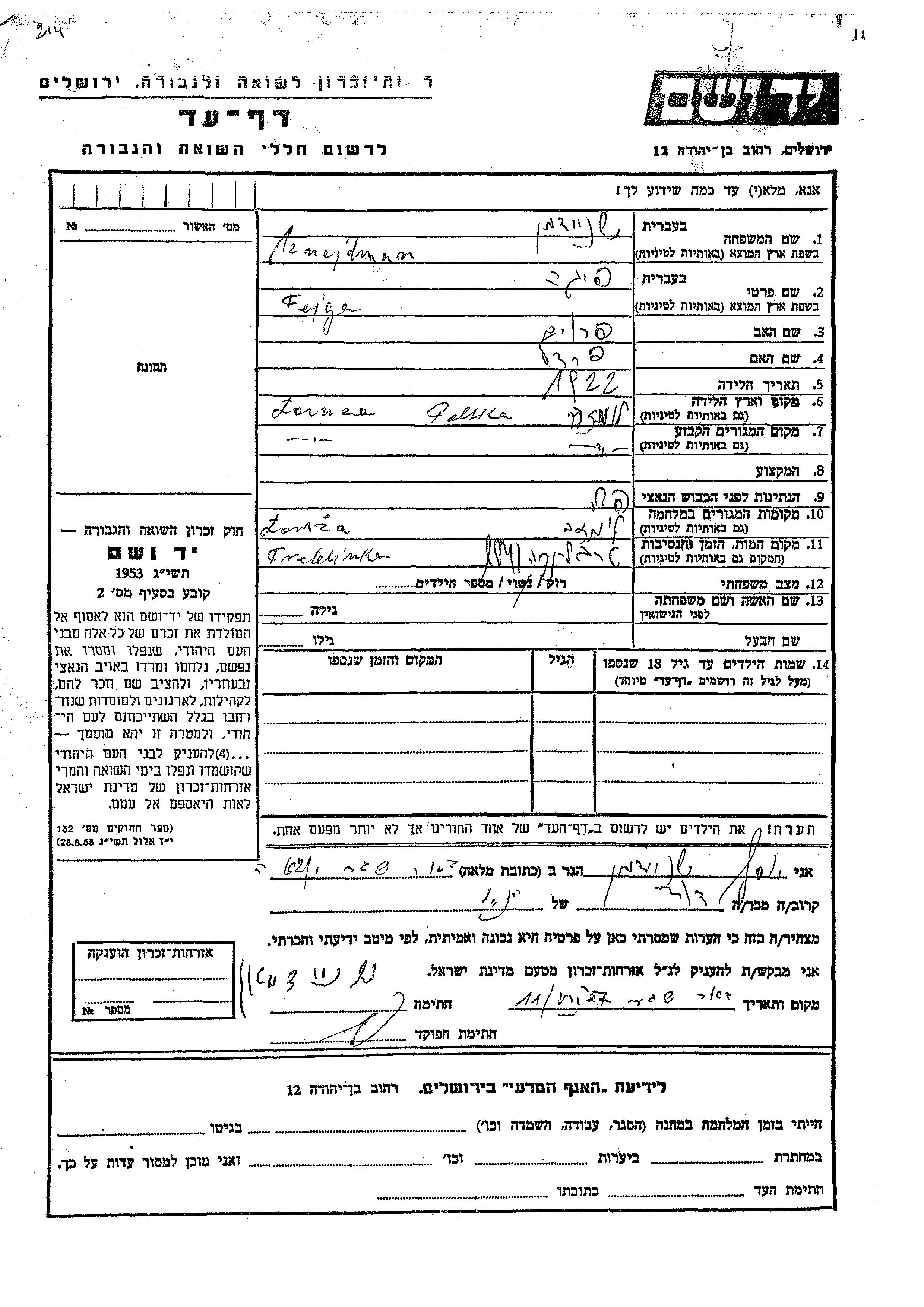Feiga Sznejdman was born in Łomża, Poland, 1922 to From and Fradel. She was single. Prior to WWII she lived in Łomża, Poland. During the war she was in Łomża, Poland. Feiga was murdered in the Shoah. Place of death: Treblinka, Poland, 1941.