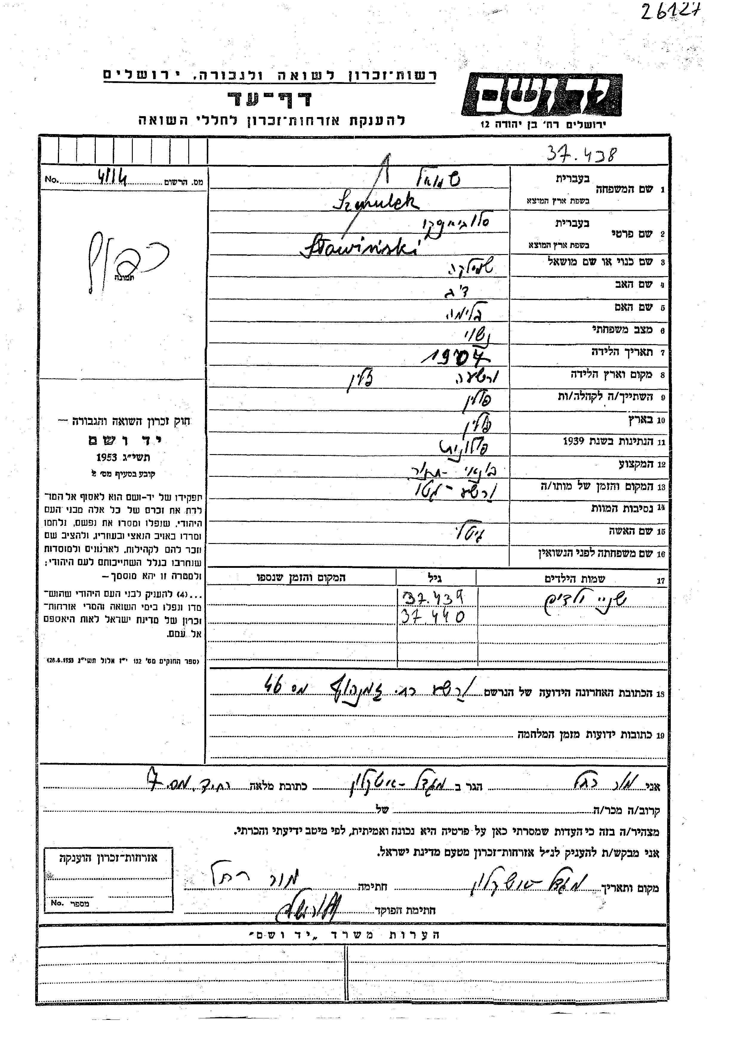 Szmulek Slawinski Slovianski was born in Warsaw, Poland, 1907 to Dov and Bluma. He was a builder and married to Gitel. Prior to WWII he lived in Warsaw, Poland.