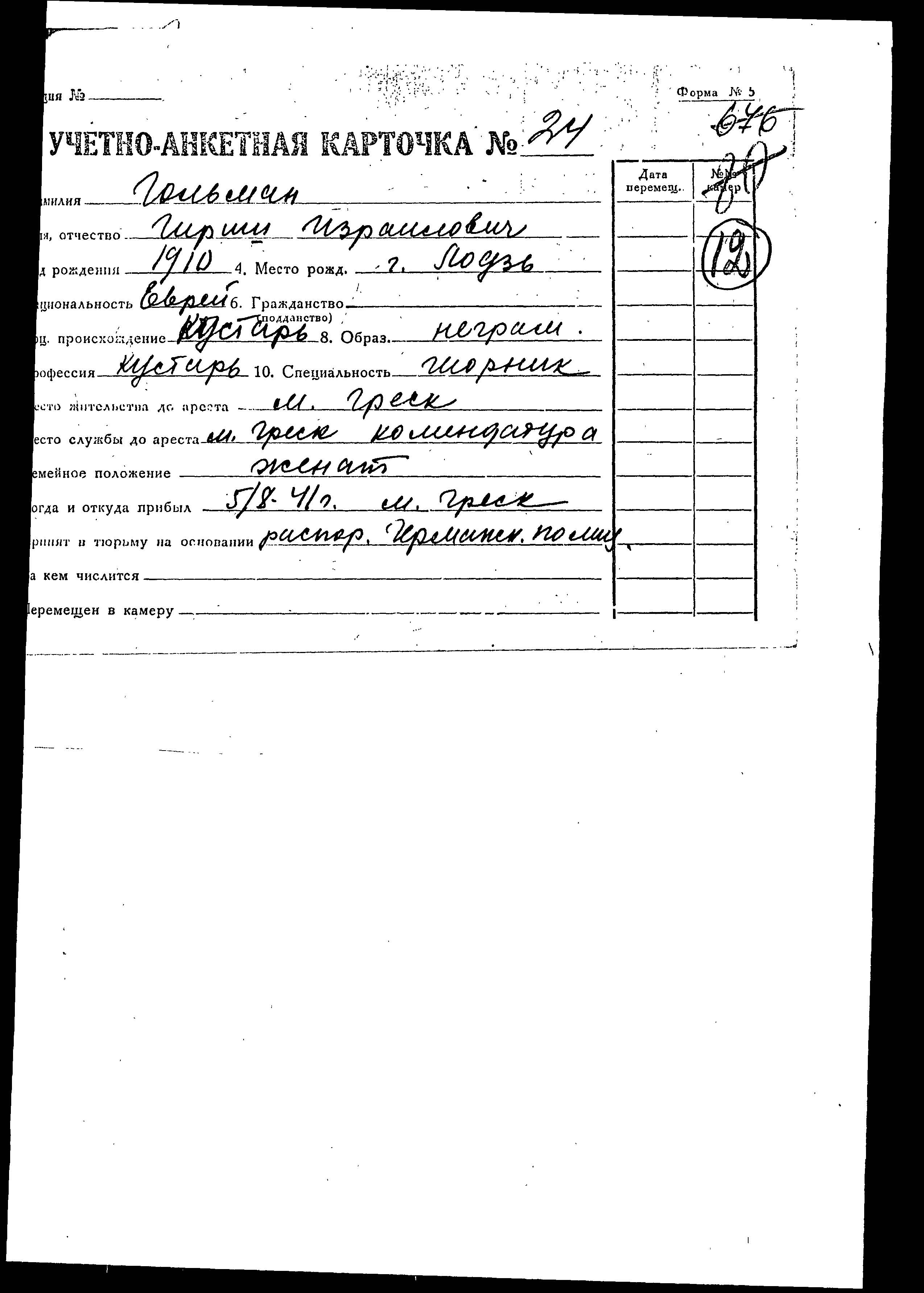 Girsh Golman was born in Lodz, Poland, 1910 to Izrail. He was a saddler and married. Prior to WWII he lived in Gressk, Belorussia (USSR). During the war he was in Gressk, Belorussia (USSR).