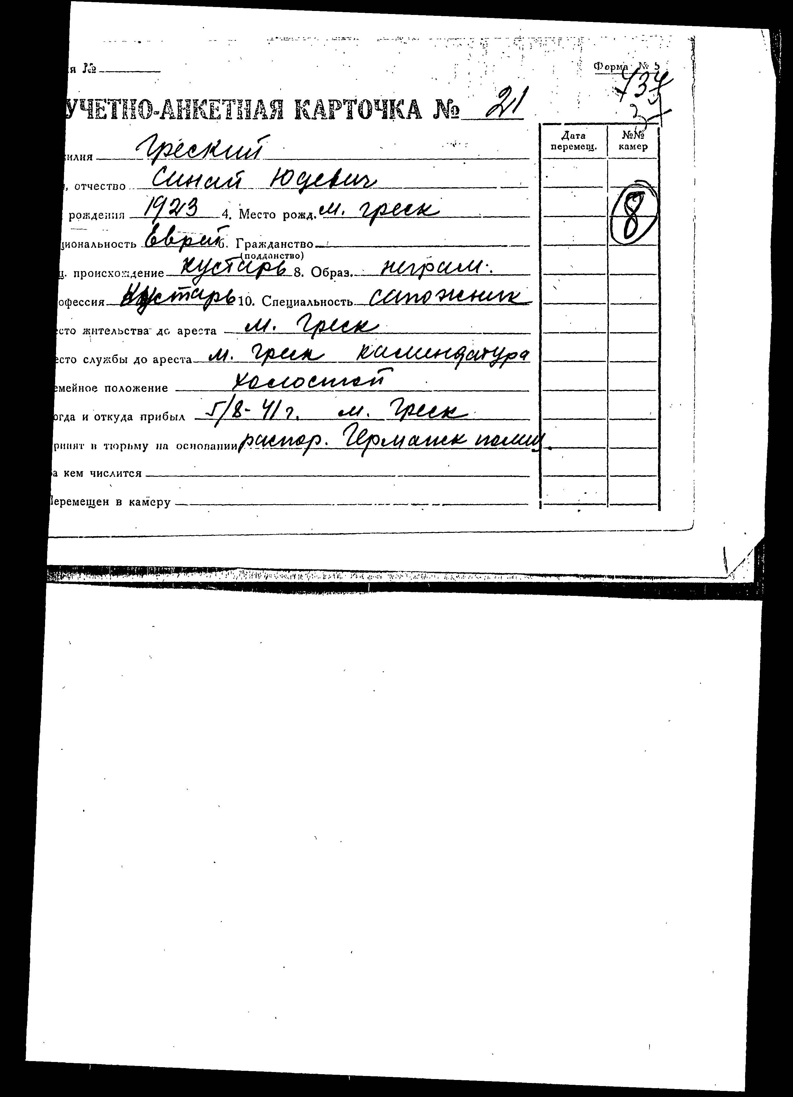Sinay Greski was born in Gressk, Belorussia (USSR), 1923 to Yuda. He was a shoemaker. Prior to WWII he lived in Gressk, Belorussia (USSR). During the war he was in Gressk, Belorussia (USSR).