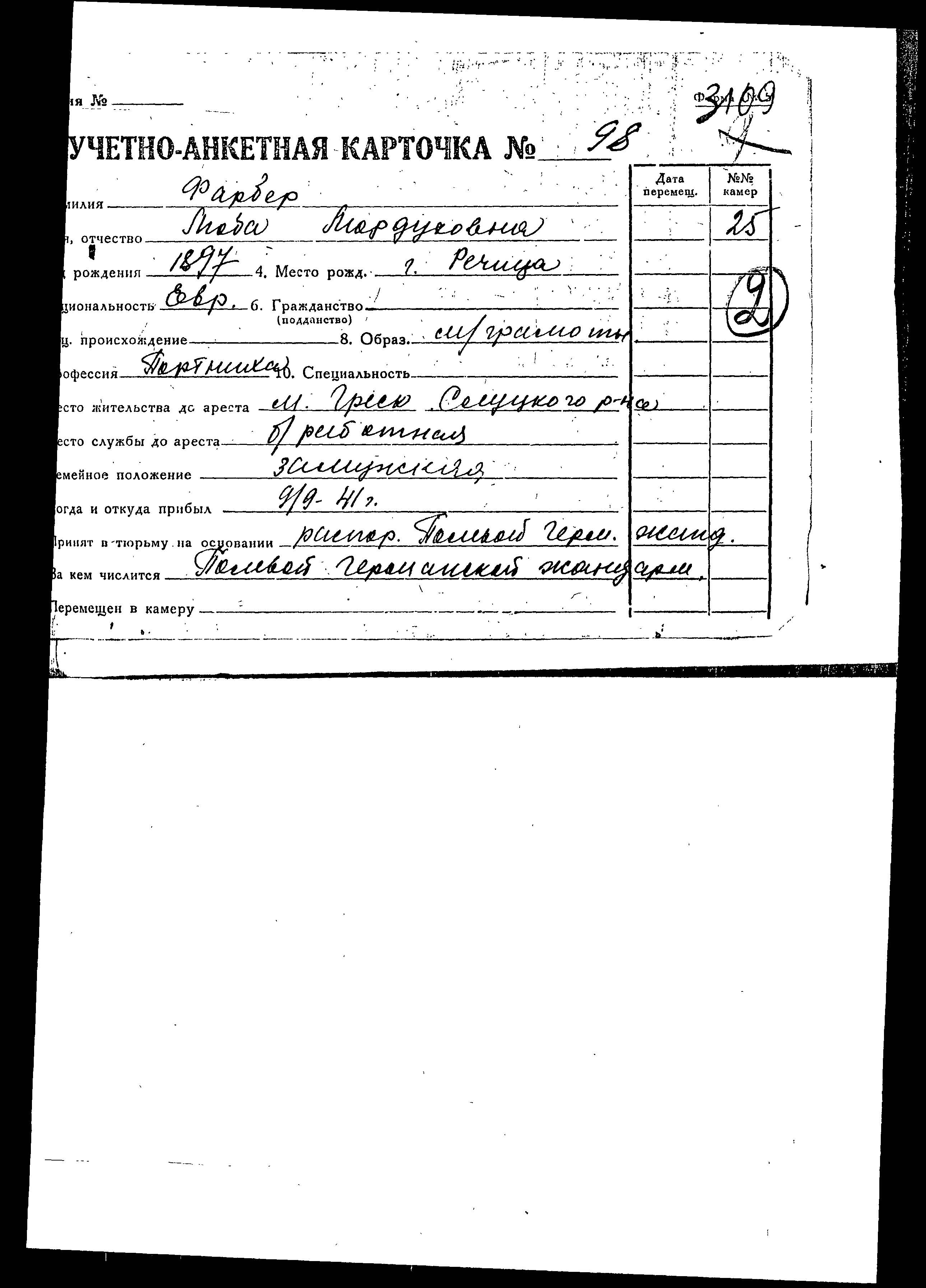 Lyuba Farber was born in Rechitsa, Belorussia (USSR), 1897 to Mordukh. She was a seamstress and married. Prior to WWII she lived in Gressk, Belorussia (USSR). During the war she was in Slutsk, Belorussia (USSR).