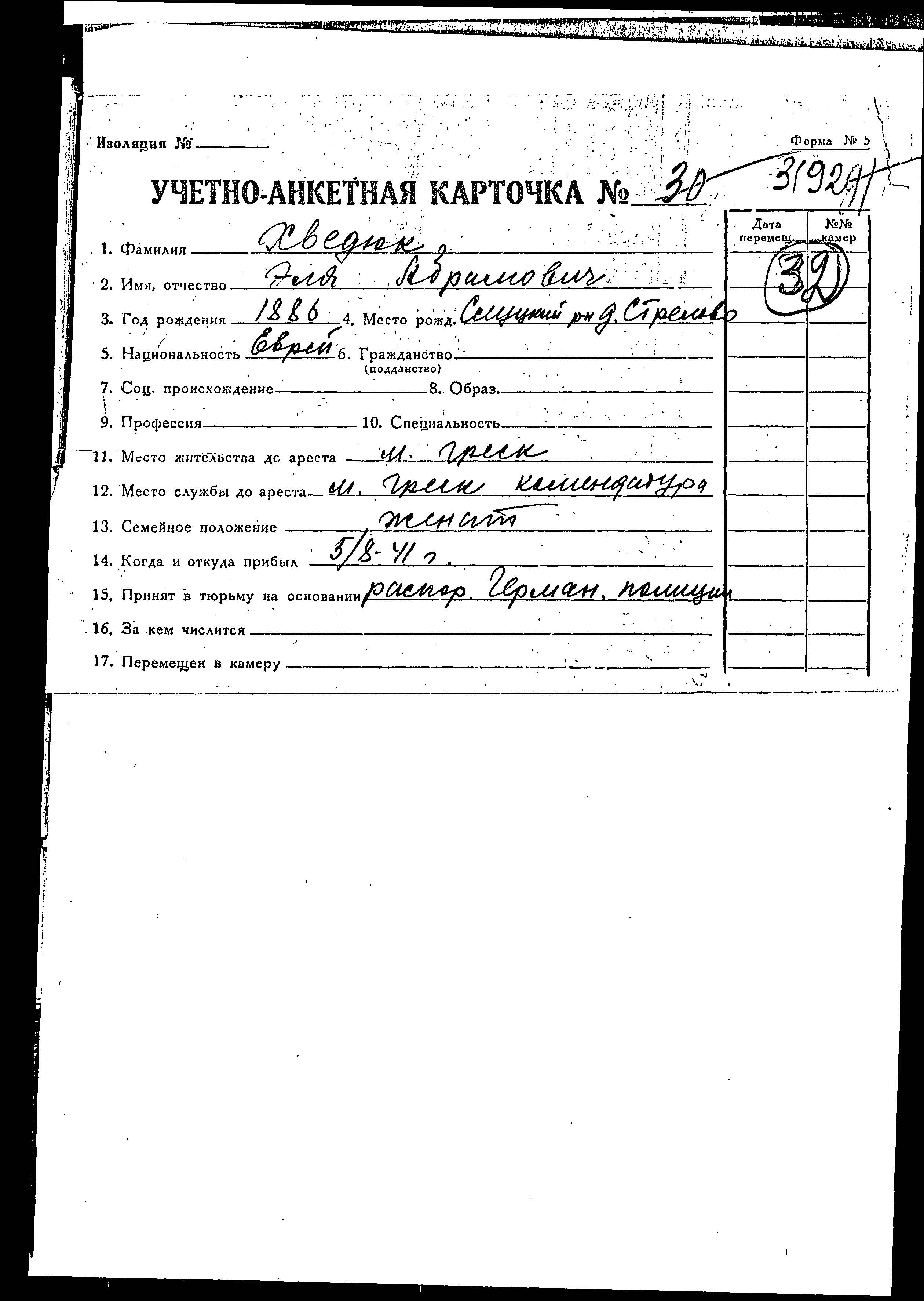 Elya Khvedyuk was born, 1886 to Abram. He was married. Prior to WWII he lived in Gressk, Belorussia (USSR). During the war he was in Slutsk, Belorussia (USSR).