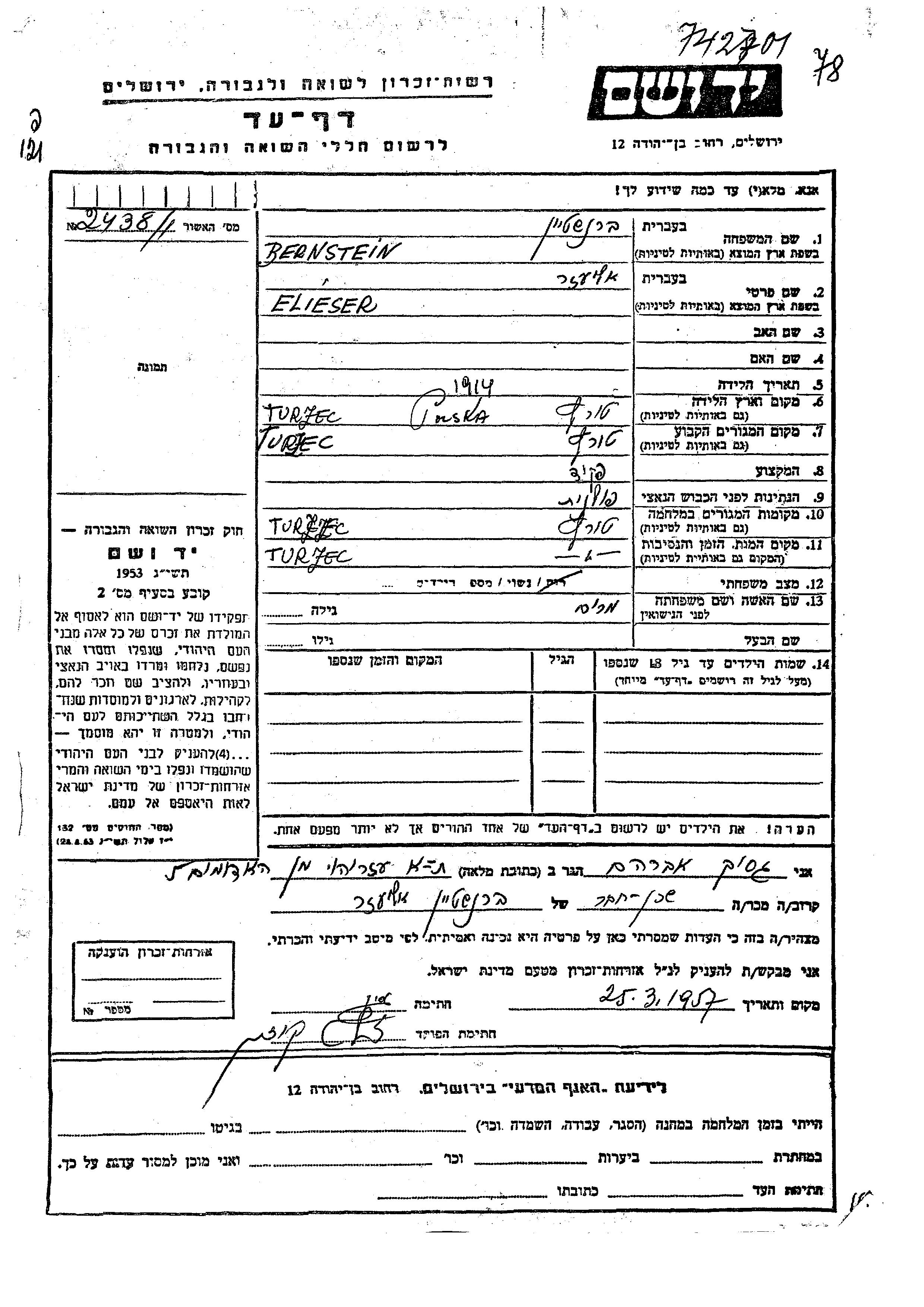 Elieser Bernstein Branshtein was born in Turzec, Poland, 1914. He was a clerk and married to Miriam. Prior to WWII he lived in Turzec, Poland. During the war he was in Turzec, Poland. Elieser was murdered in the Shoah. Place of death: Turzec, Poland.