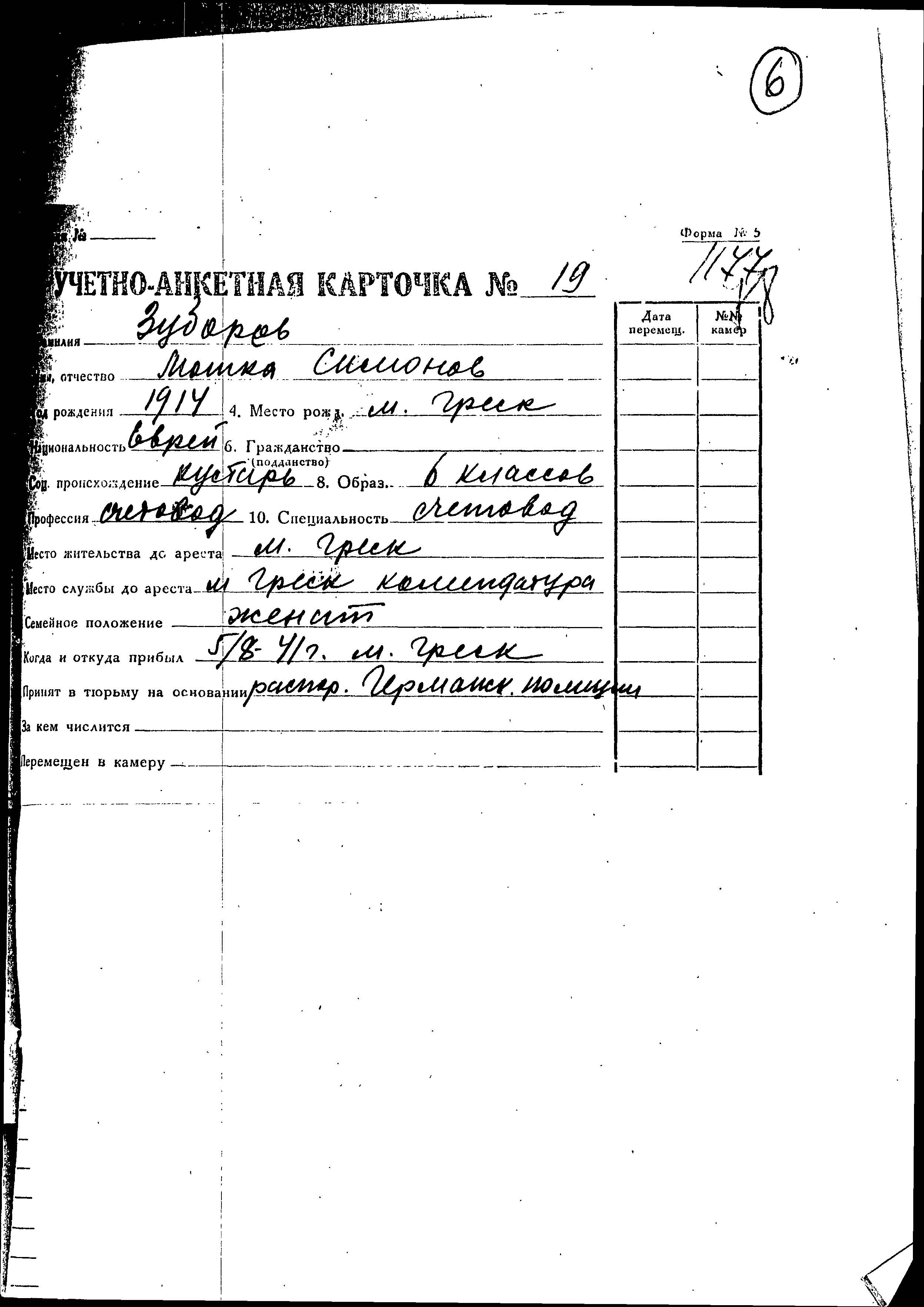 Motka Zuborov was born in Gressk, Belorussia (USSR), 1914 to Simon. He was a bookkeeper and married. Prior to WWII he lived in Gressk, Belorussia (USSR). During the war he was in Slutsk, Belorussia (USSR).