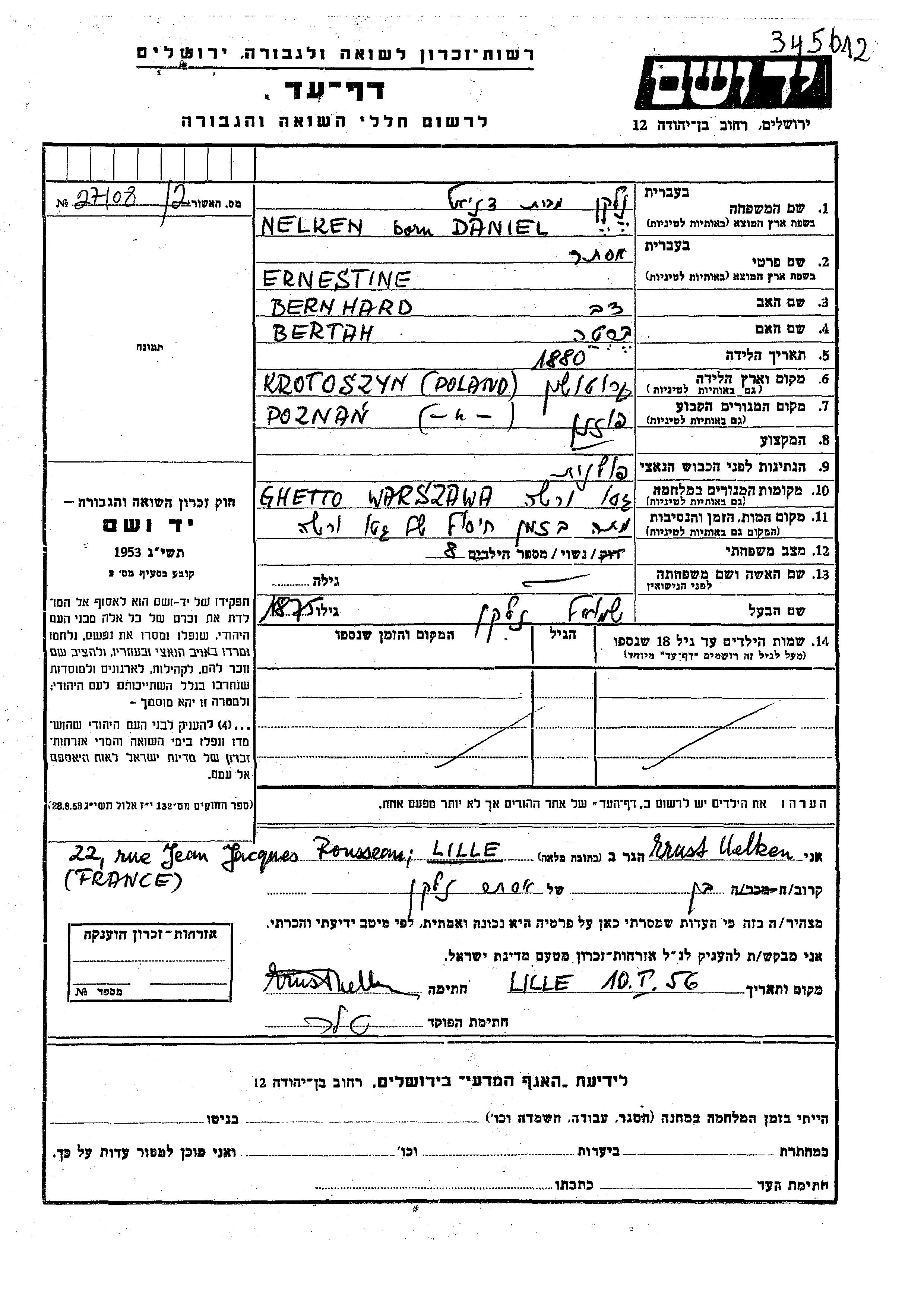 Ernestine Ester Nelken nee Daniel was born in Krotoszyn, Poland, 1880 to Bernhard Dov and Bertah. She was married to Shmuel. Prior to WWII she lived in Poznan, Poland. During the war she was in Warszawa, Poland. Ernestine Ester was murdered in the Shoah. Place of death: Warszawa, Poland.