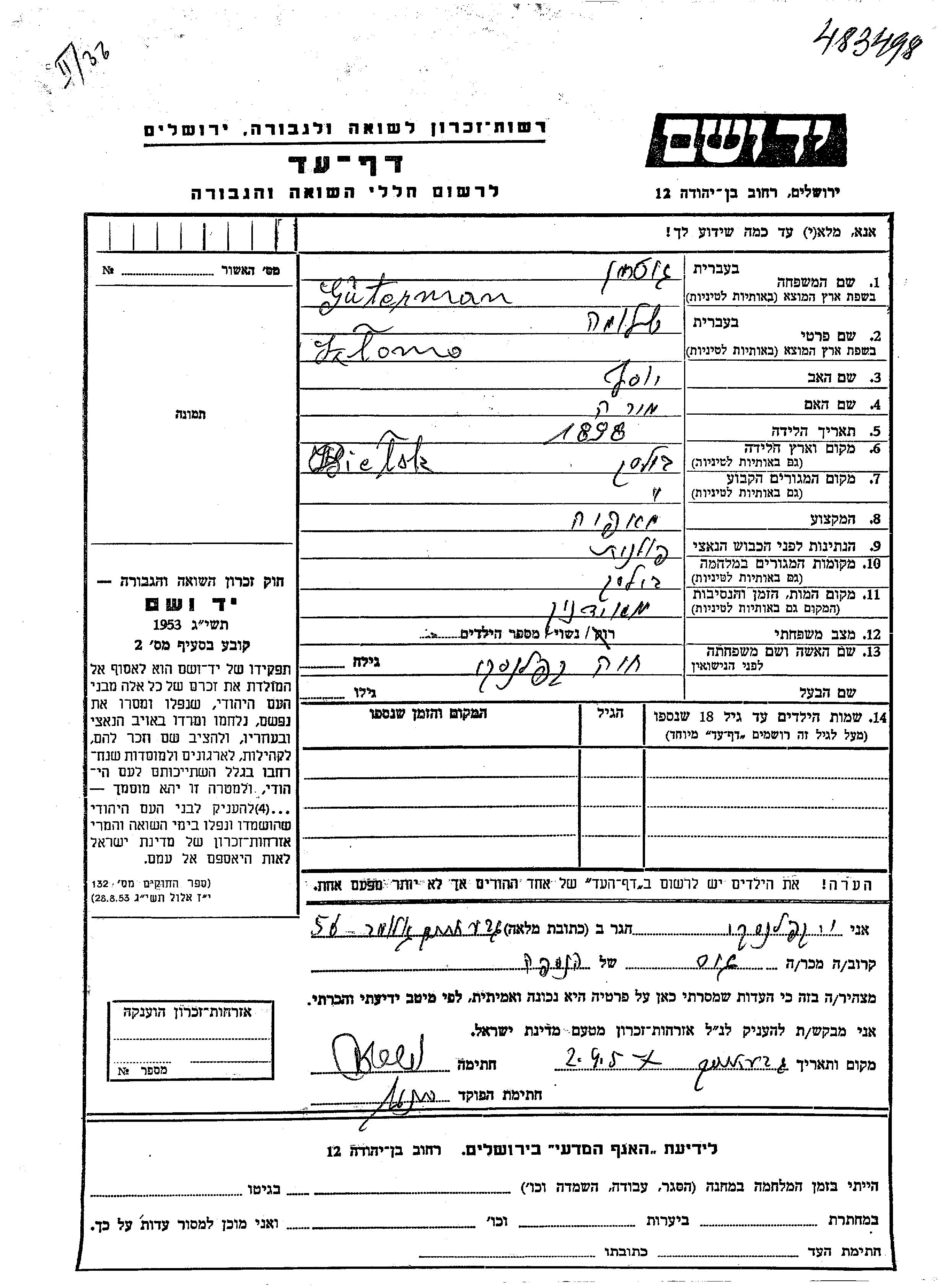 Szlomo Guterman was born in Bielsk, Poland, 1898 to Yosef and Mira. He was a baker and married to Khaia nee Kaplanski. Prior to WWII he lived in Bielsk, Poland. During the war he was in Bielsk, Poland. Szlomo was murdered in the Shoah. Place of death: Majdanek, Poland.