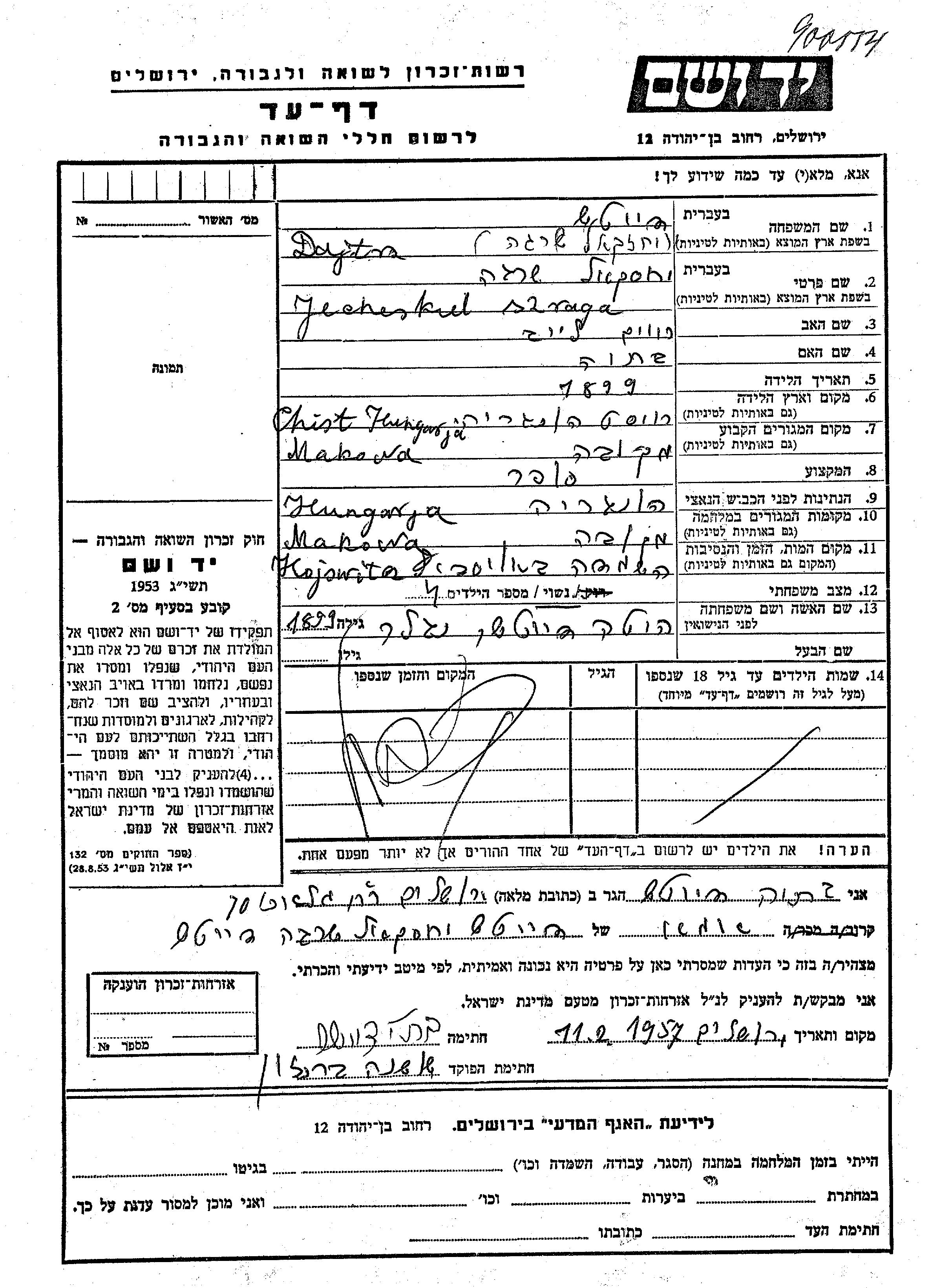 Dajtsz Yecheskel Szraga 1899 Makov, Czechoslovakia Page of Testimony