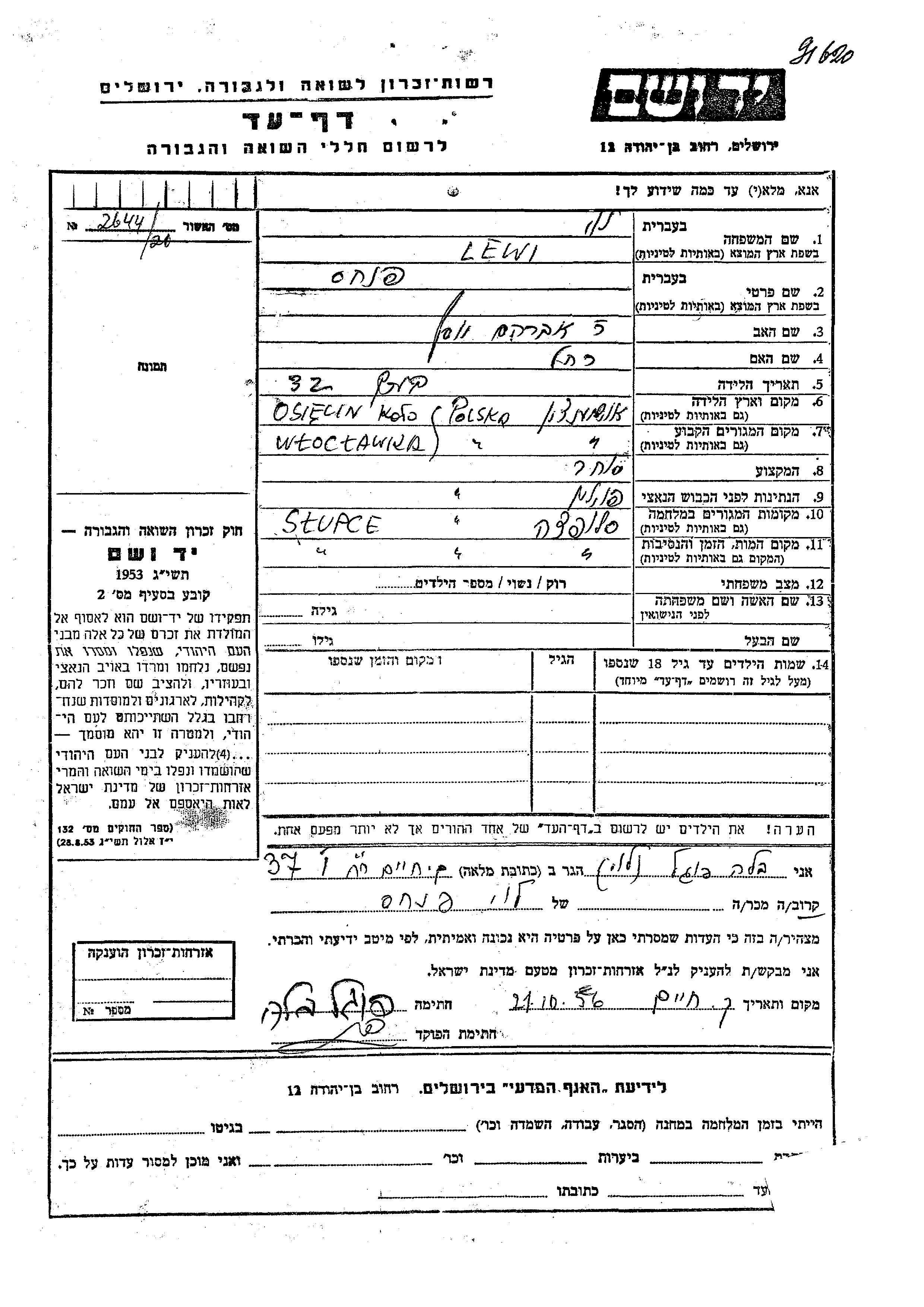 Pinkhas Lewi was born in Osieciny, Poland to Avraham Yosef and Rakhel. He was a merchant. Prior to WWII he lived in Osieciny, Poland. During the war he was in Slupca, Poland.