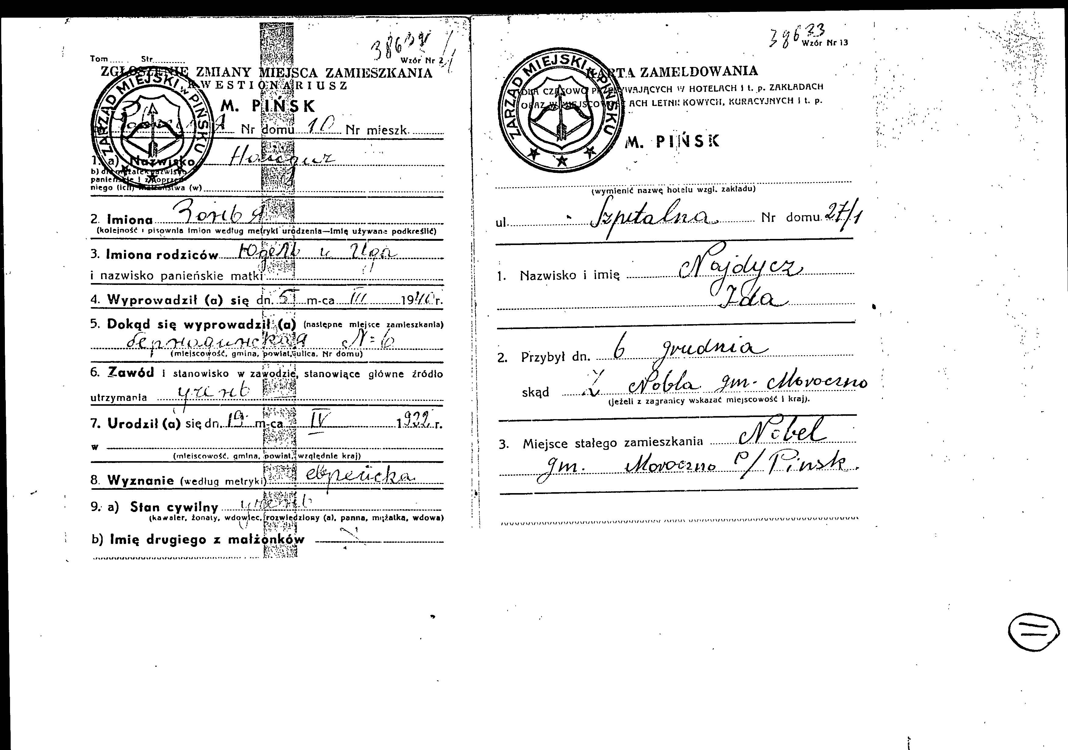 Zonya Najdycz was born in Drogichin, Poland, 1922 to Yudel and Ida. He was a pupil and single. Prior to WWII he lived in Pinsk, Poland.