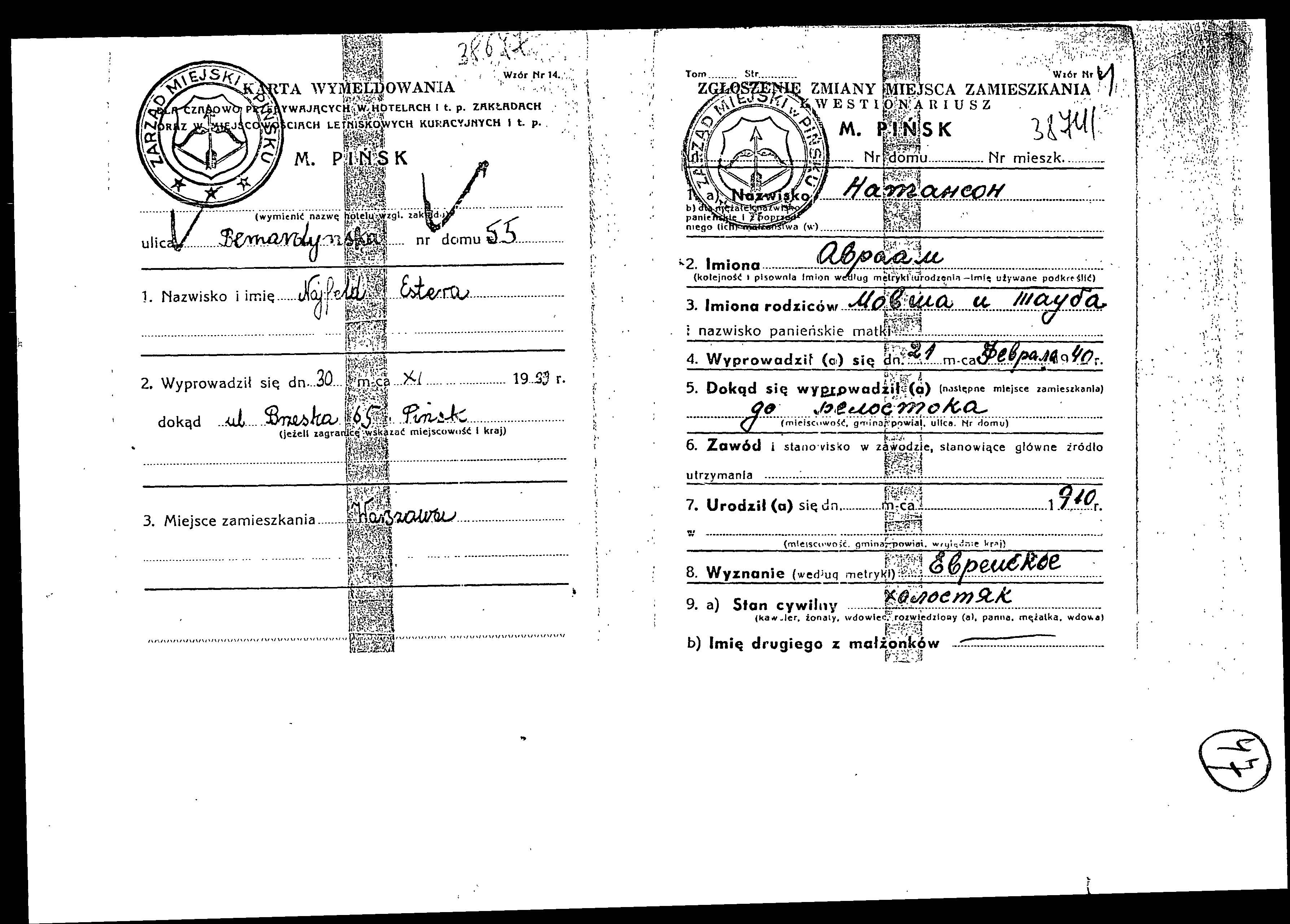 Registration card file of the Jewish residents and refugees from Pinsk whose family names start with “N”, 1939-1941