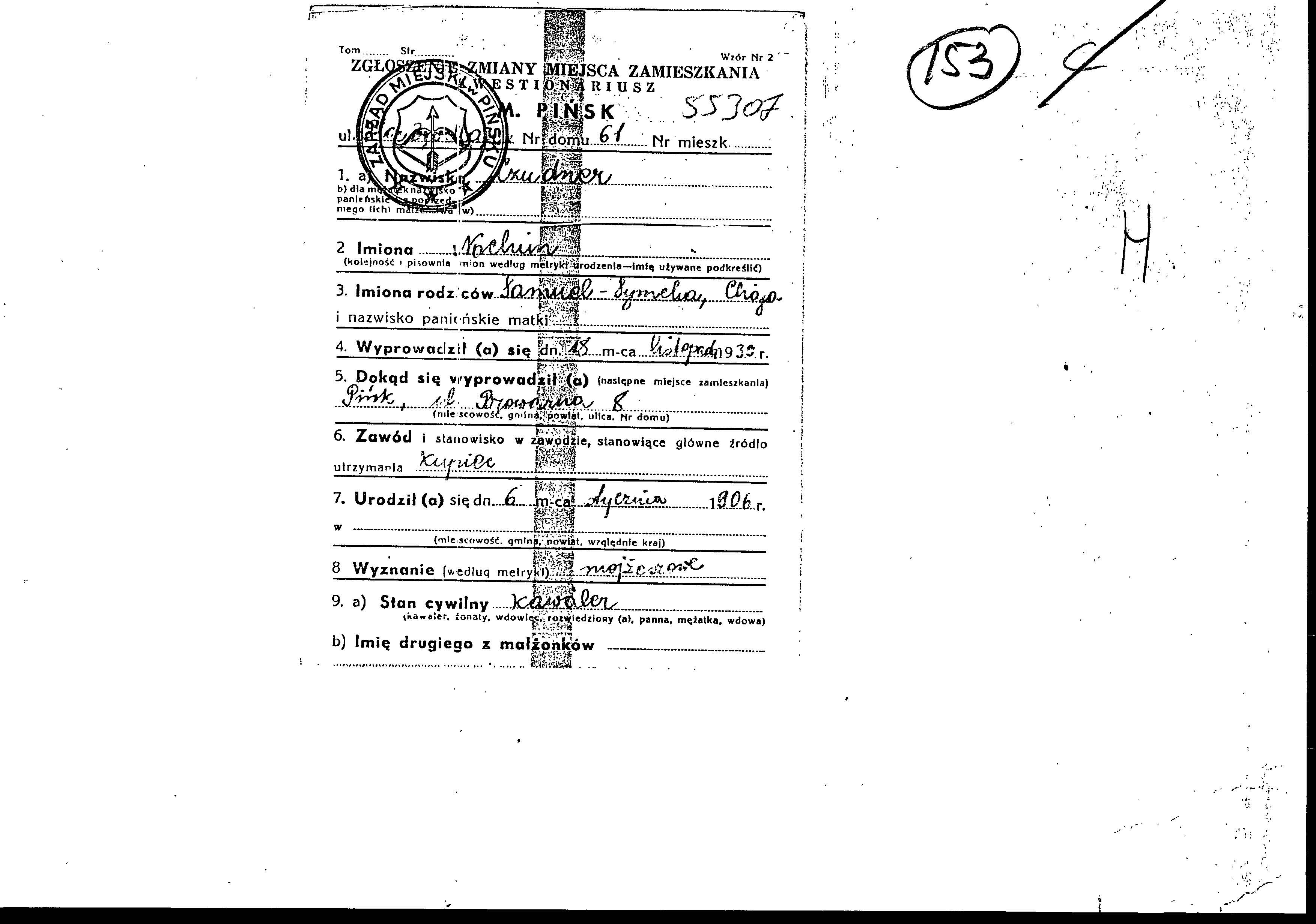 Registration card file of the Jewish residents and refugees from Pinsk whose family names start with “N”, 1939-1941