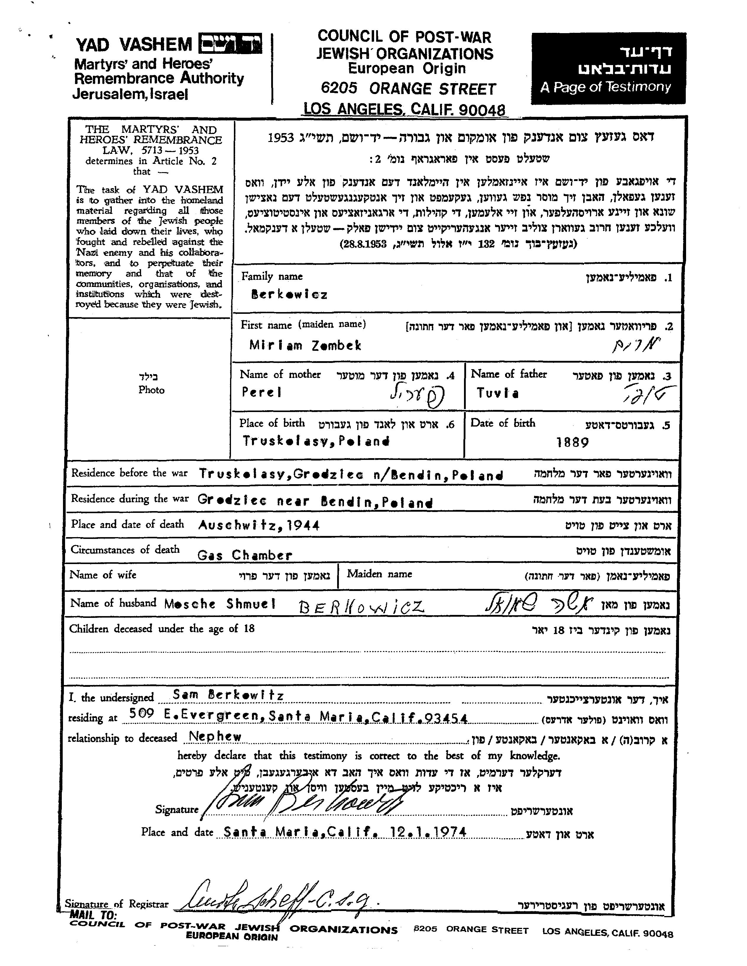 Miriam Berkovicz nee Zombek was born in Truskolasy, Poland, 1889 to Tobi Tuvia and Peril. She was married to Mosze Shmuel. Prior to WWII she lived in Grodziec, Poland. During the war she was in Grodziec, Poland. Miriam was murdered in the Shoah. Place of death: Auschwitz, Poland, 1944.