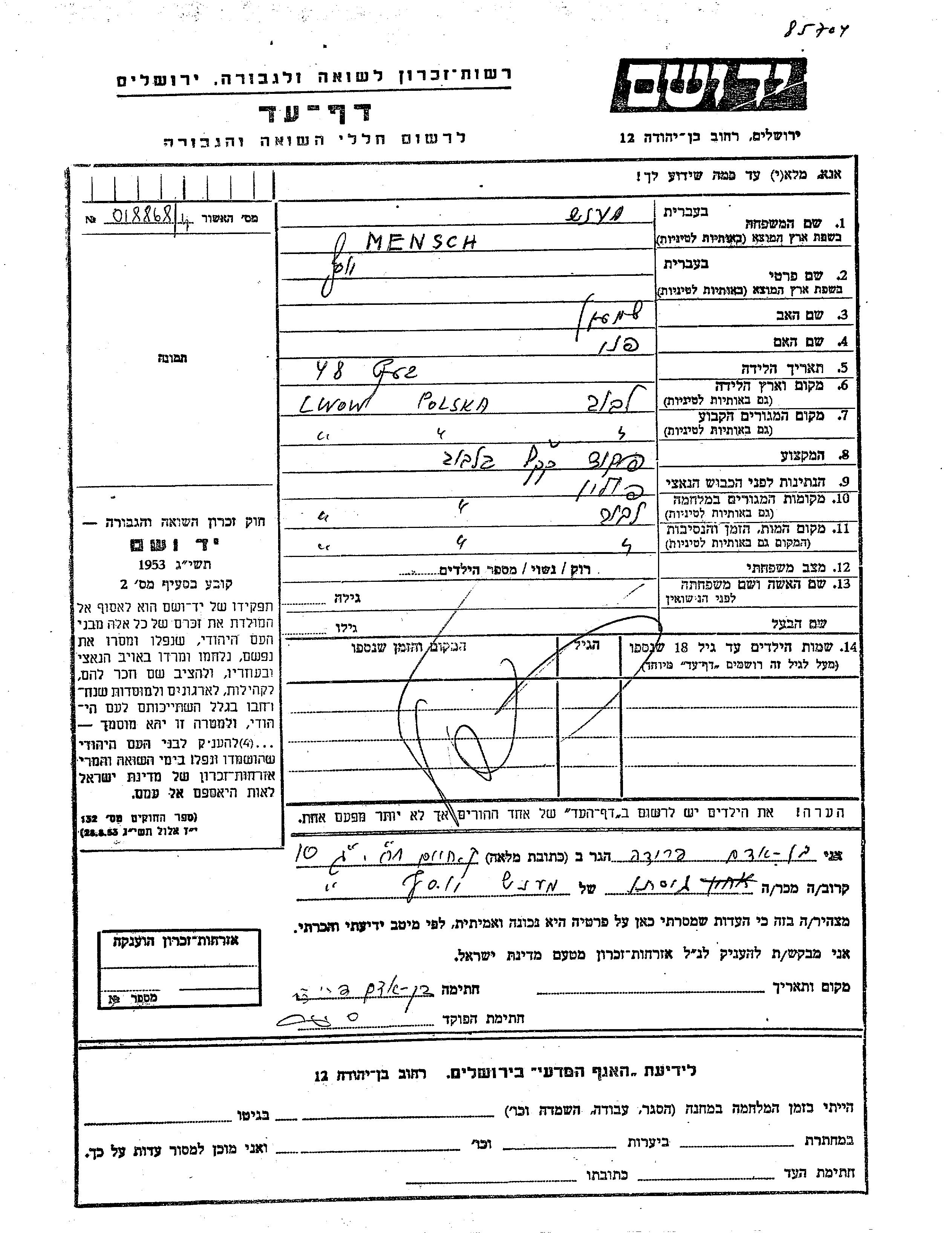 Yosef Mensch Mensh was born in Lwow, Poland to Shimon and Fani. He was a clerk. Prior to WWII he lived in Lwow, Poland. During the war he was in Lwow, Poland. Yosef was murdered in the Shoah. Place of death: Lwow, Poland.