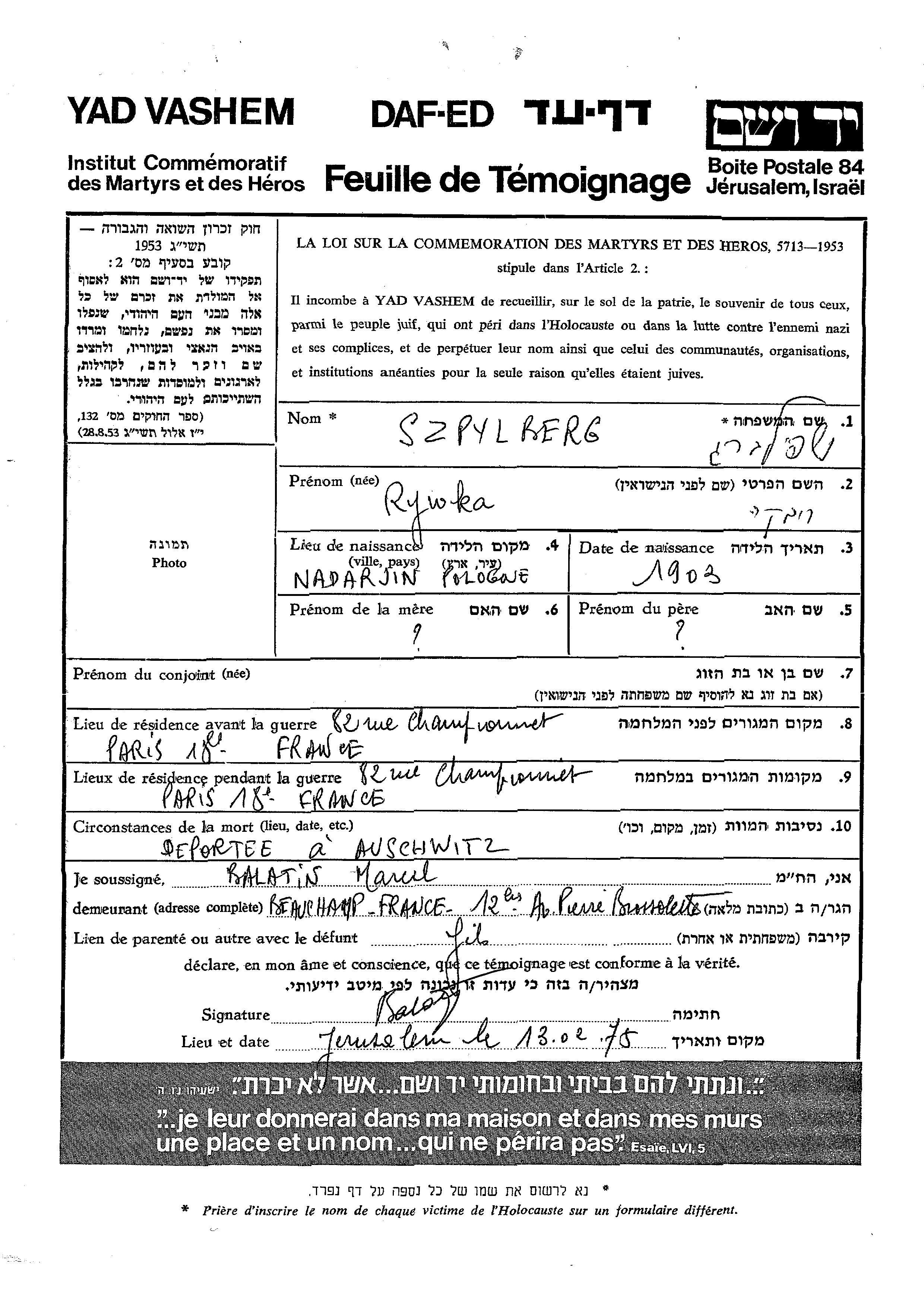 Rywka Szpylberg was born in Nadarzyn, Poland, 1903. Prior to WWII she lived in Paris, France. During the war she was in Paris, France. Rywka was murdered in the Shoah. Place of death: Auschwitz, Poland.