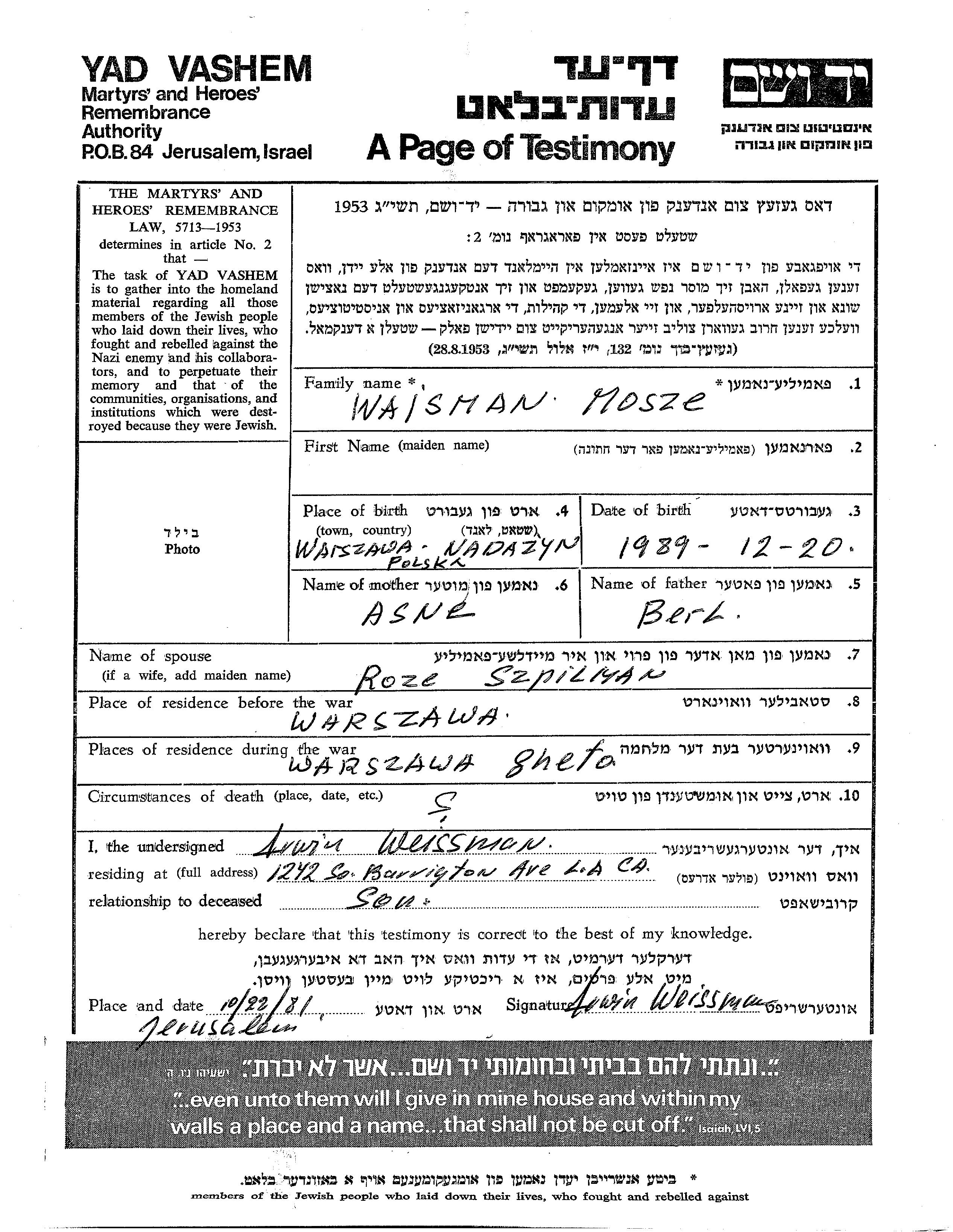 Mosze Waisman was born in Nadarzyn, Poland, 1889 to Berl and Asne. He was married to Roza nee Szpilman. Prior to WWII he lived in Warszawa, Poland. During the war he was in Warszawa, Poland. Mosze was murdered in the Shoah.