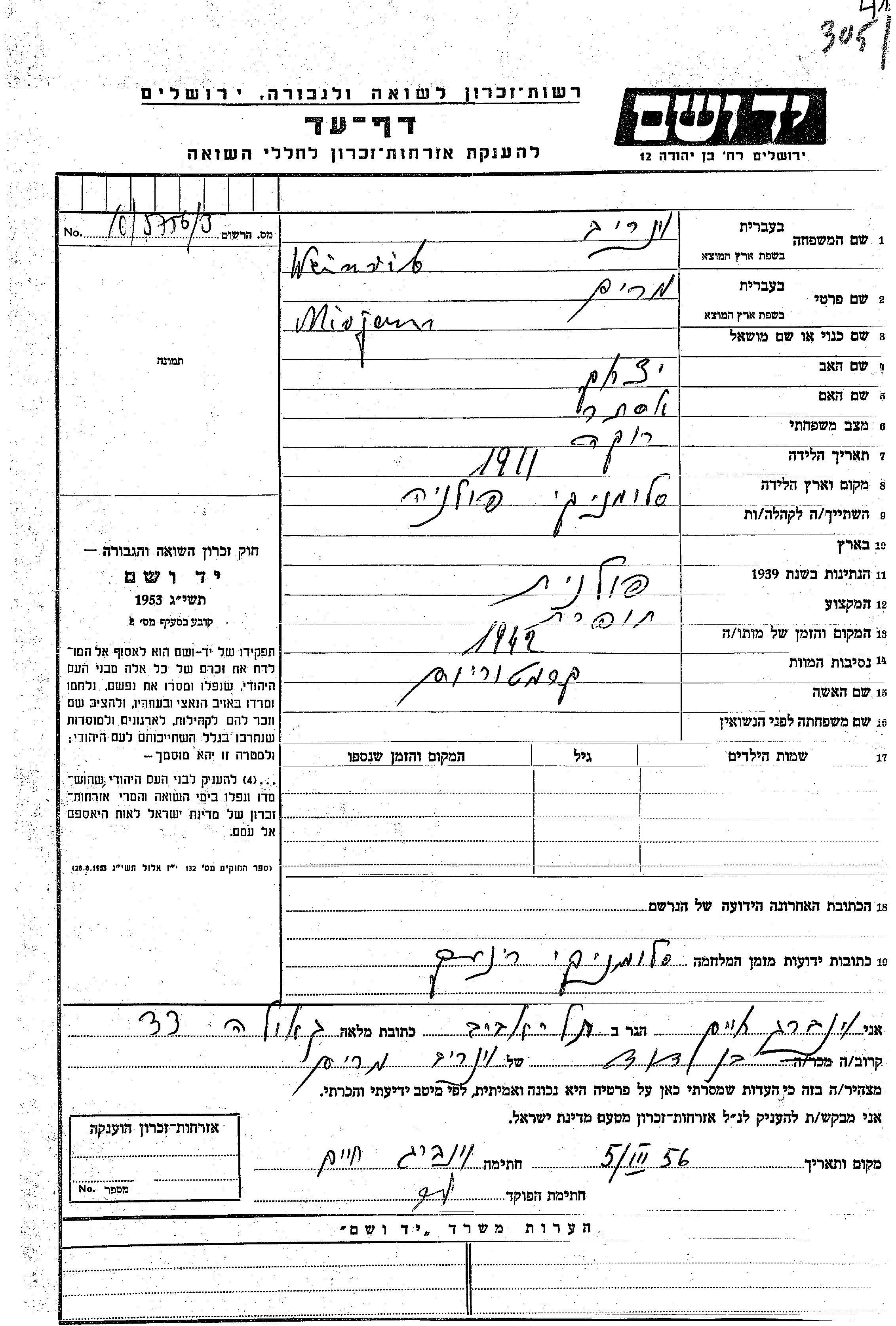 Mirjam Weinrib was born in Slomniki, Poland, 1911 to Yitzkhak and Ester. She was a seamstress and single.