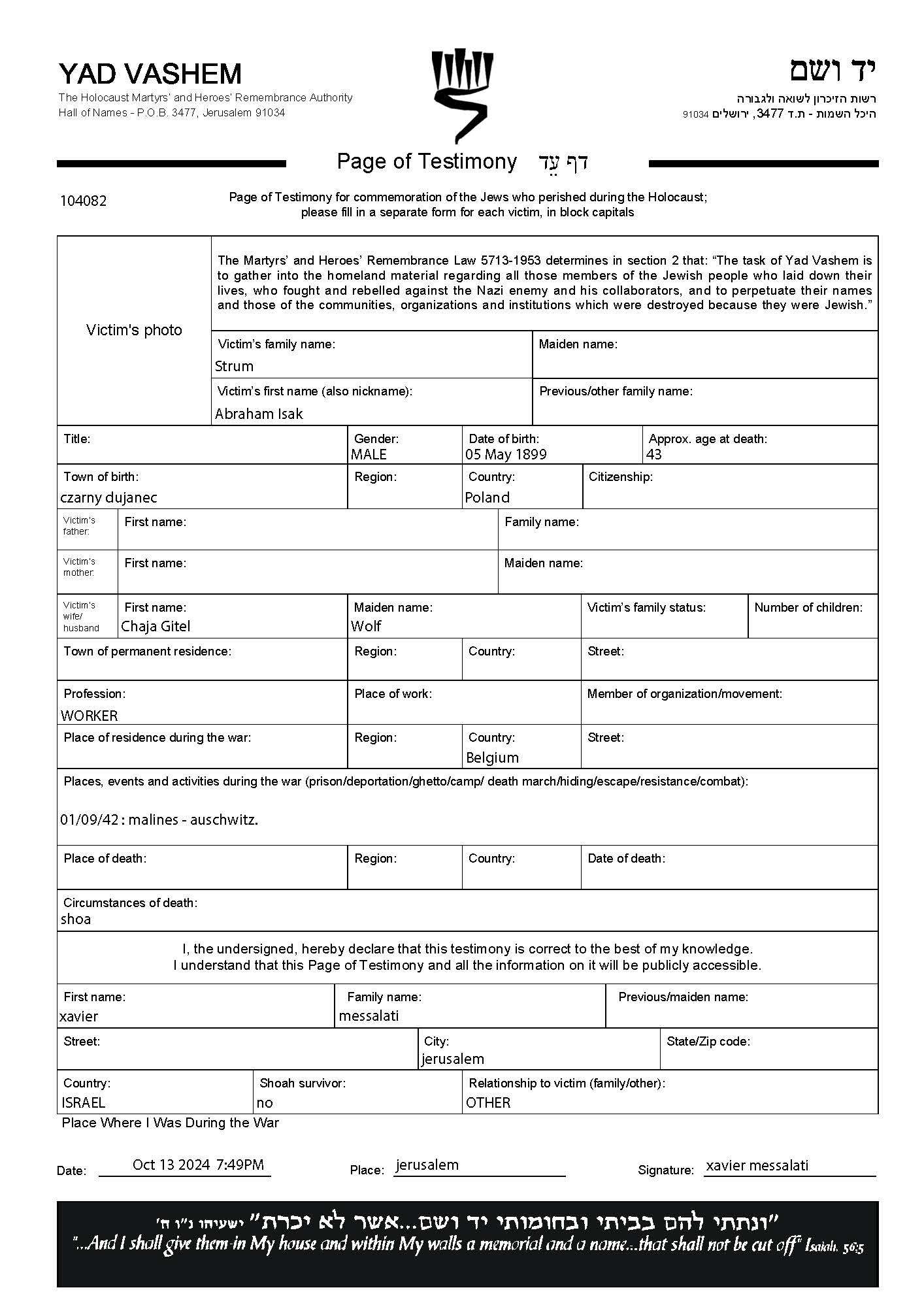 Strum Abraham Isak 1899 unstated place, Page of Testimony (digital)