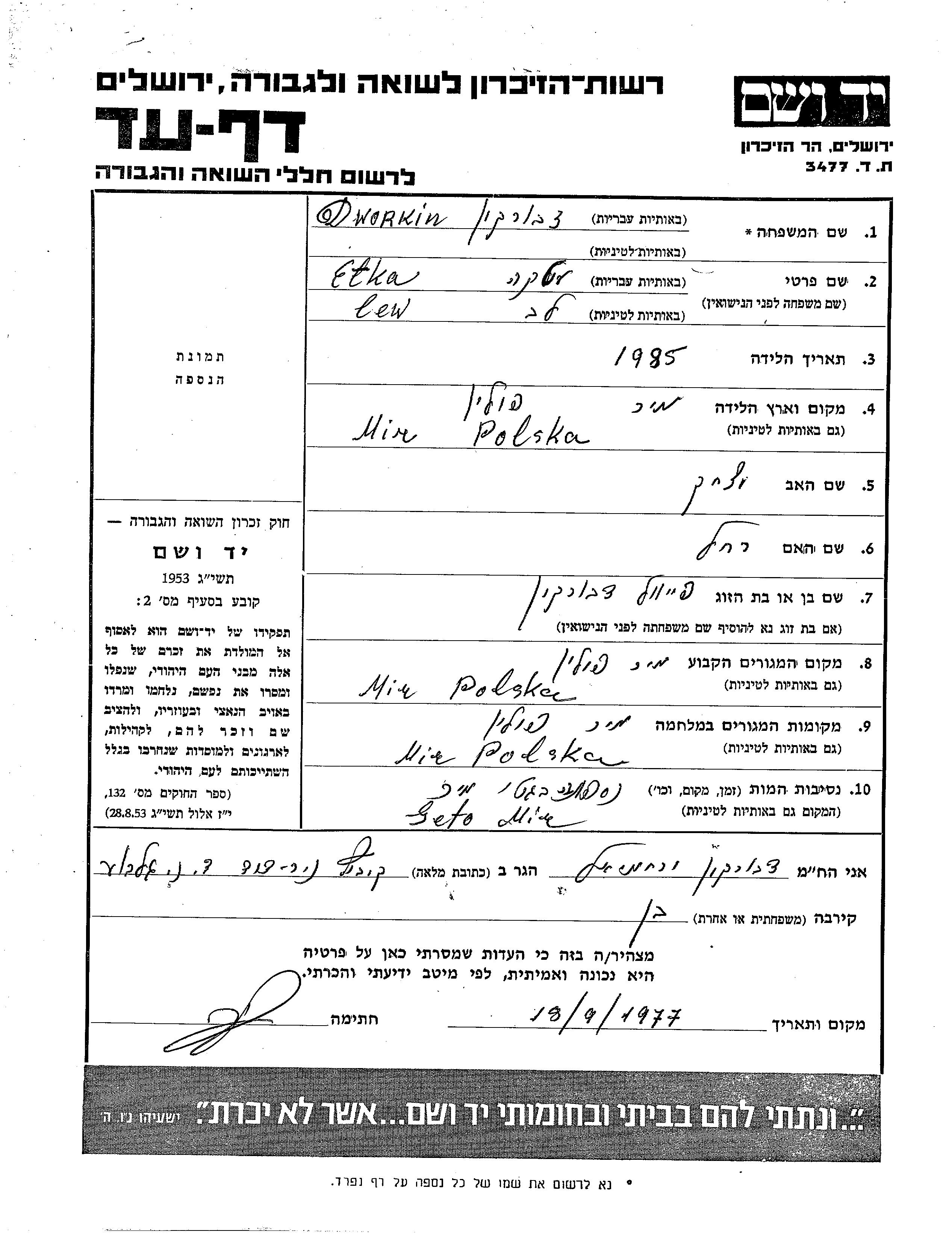Etka Dworkin nee Lew was born in Mir, Poland, 1885 to Yitzkhak and Rakhel. She was married to Faivel. Prior to WWII she lived in Mir, Poland. During the war she was in Mir, Poland. Etka was murdered in the Shoah. Place of death: Mir, Poland.